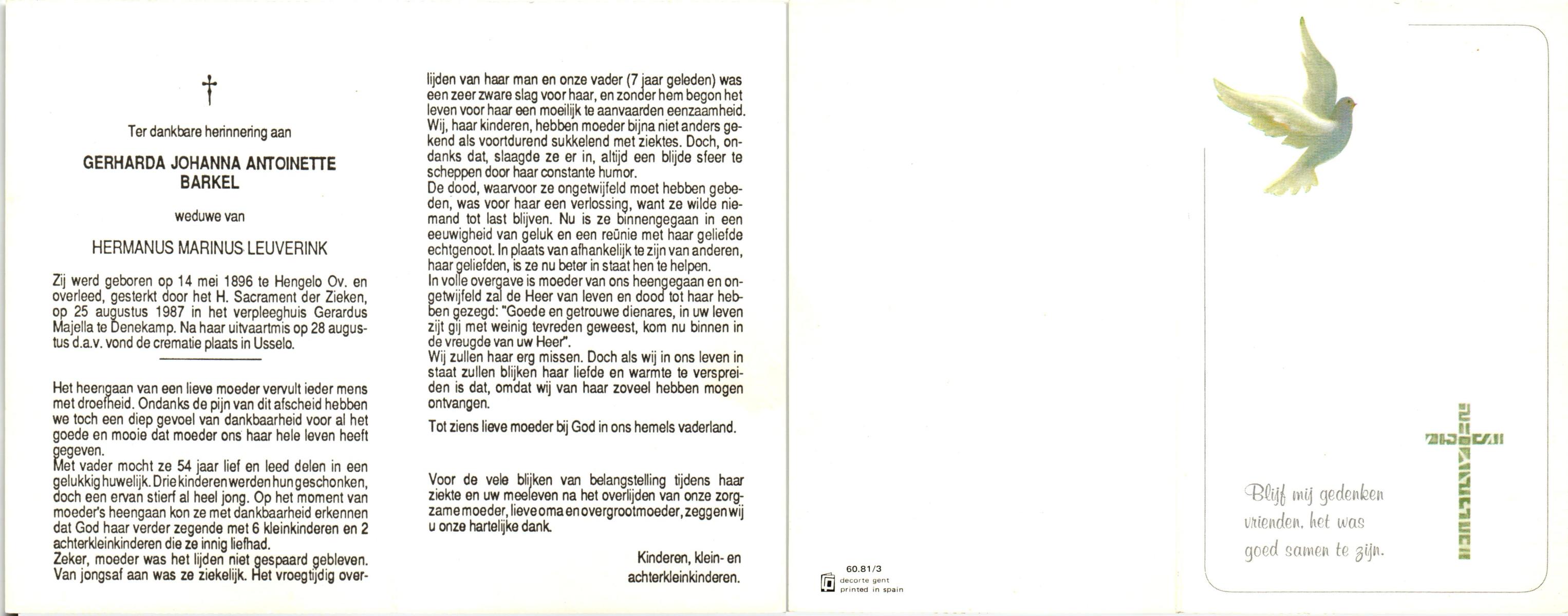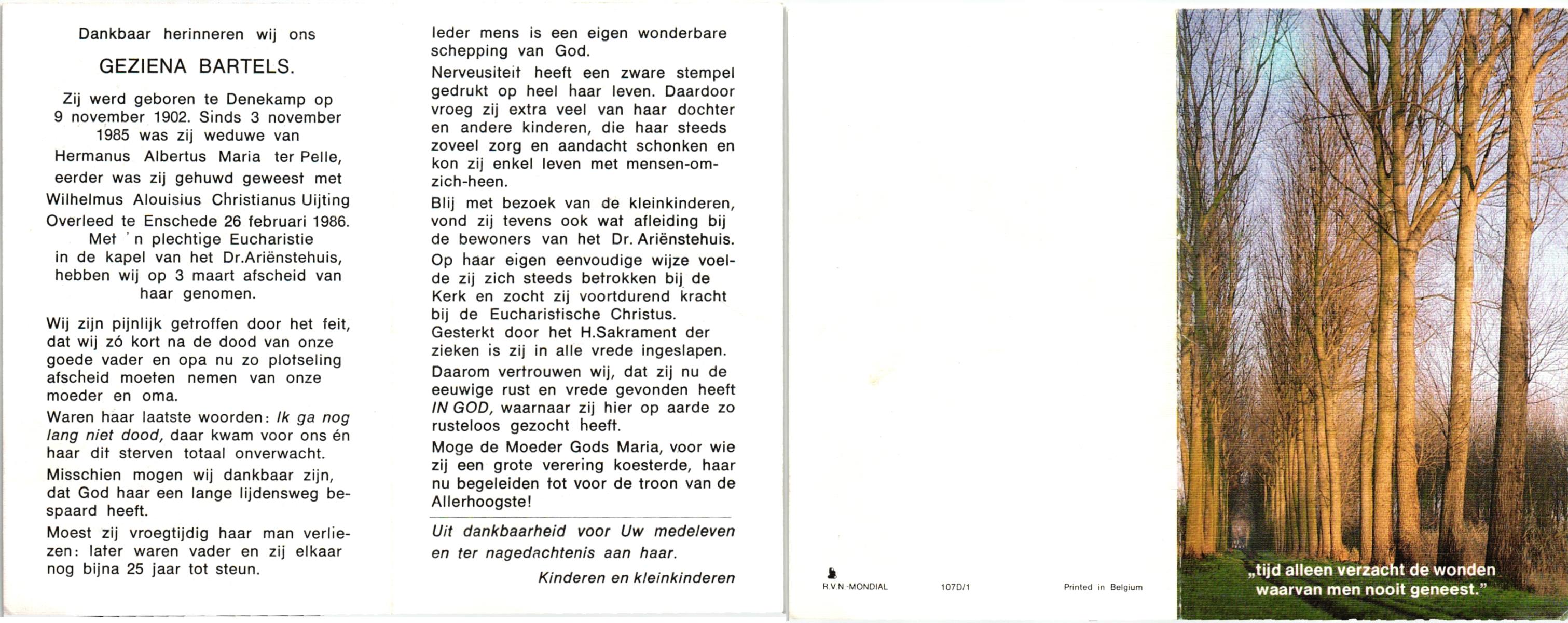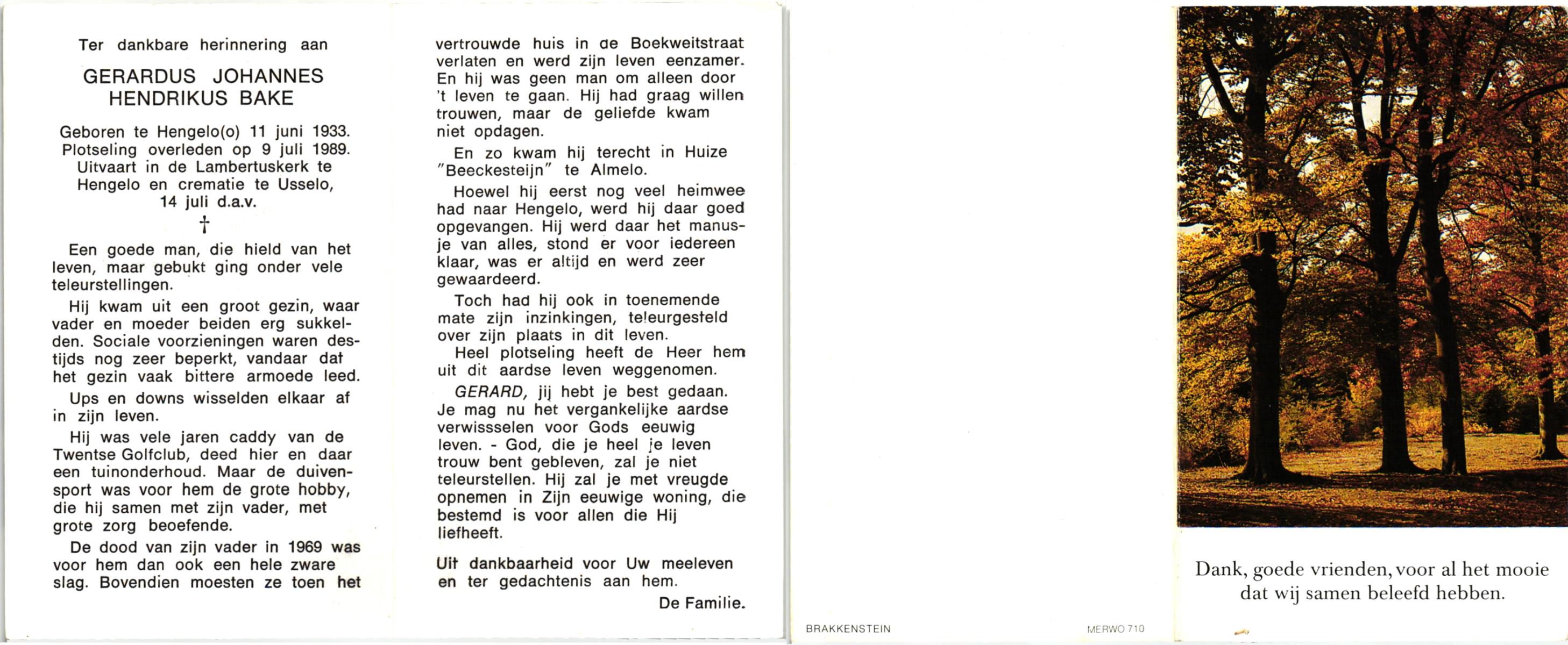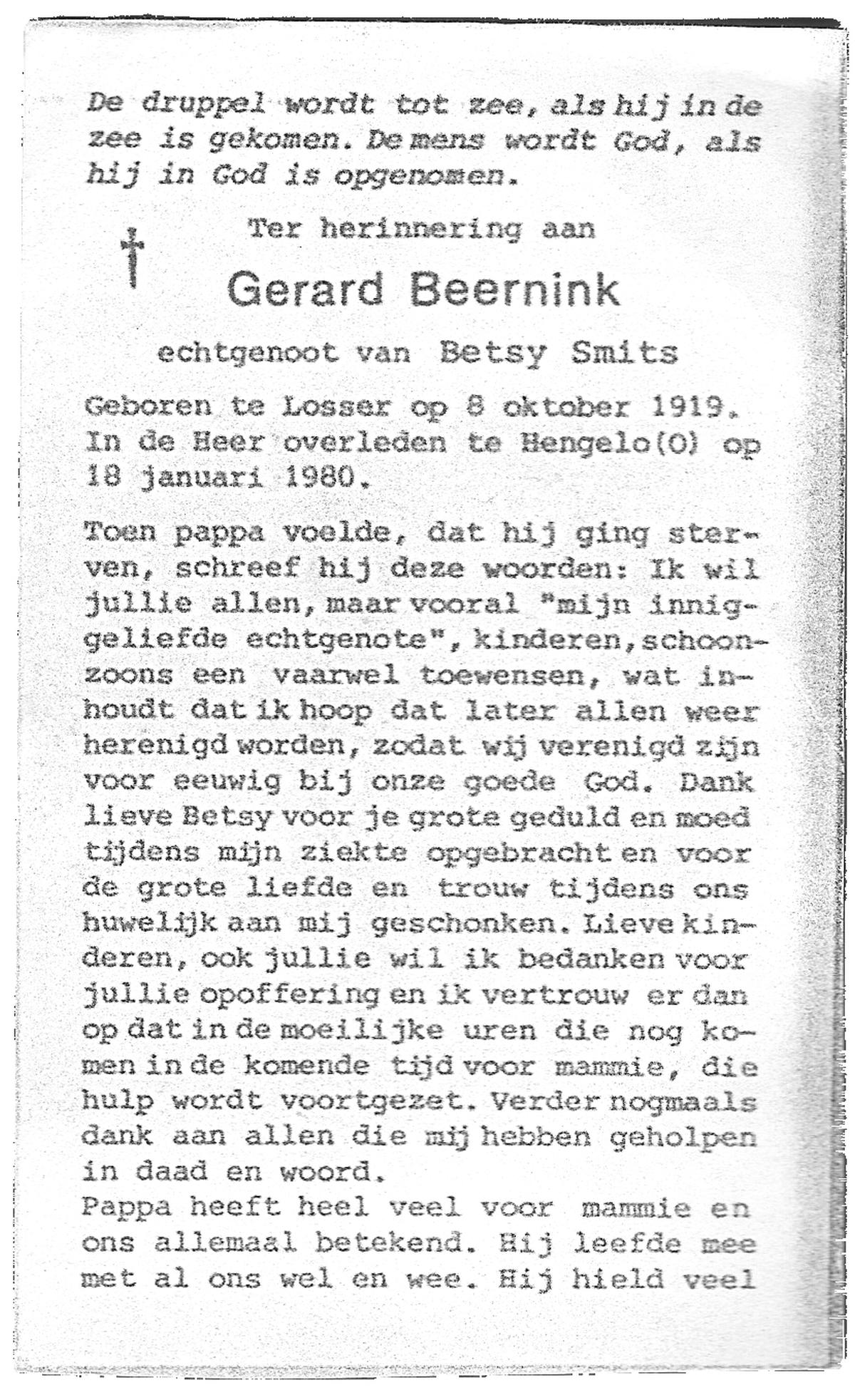 BEKE, ter, Gerhardus Johannes, geboren op 27-12-1904 te Wierden, overleden op 22-11-1986 te Almelo op 81-jarige leeftijd, begraven op 27-11-1986 te Wierden.