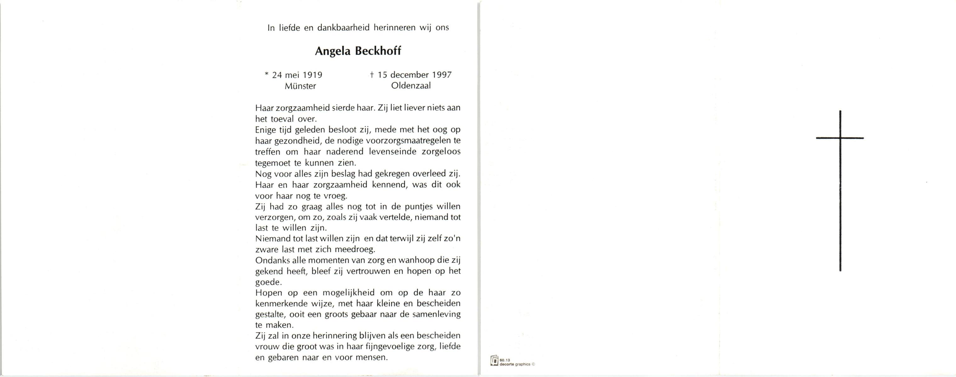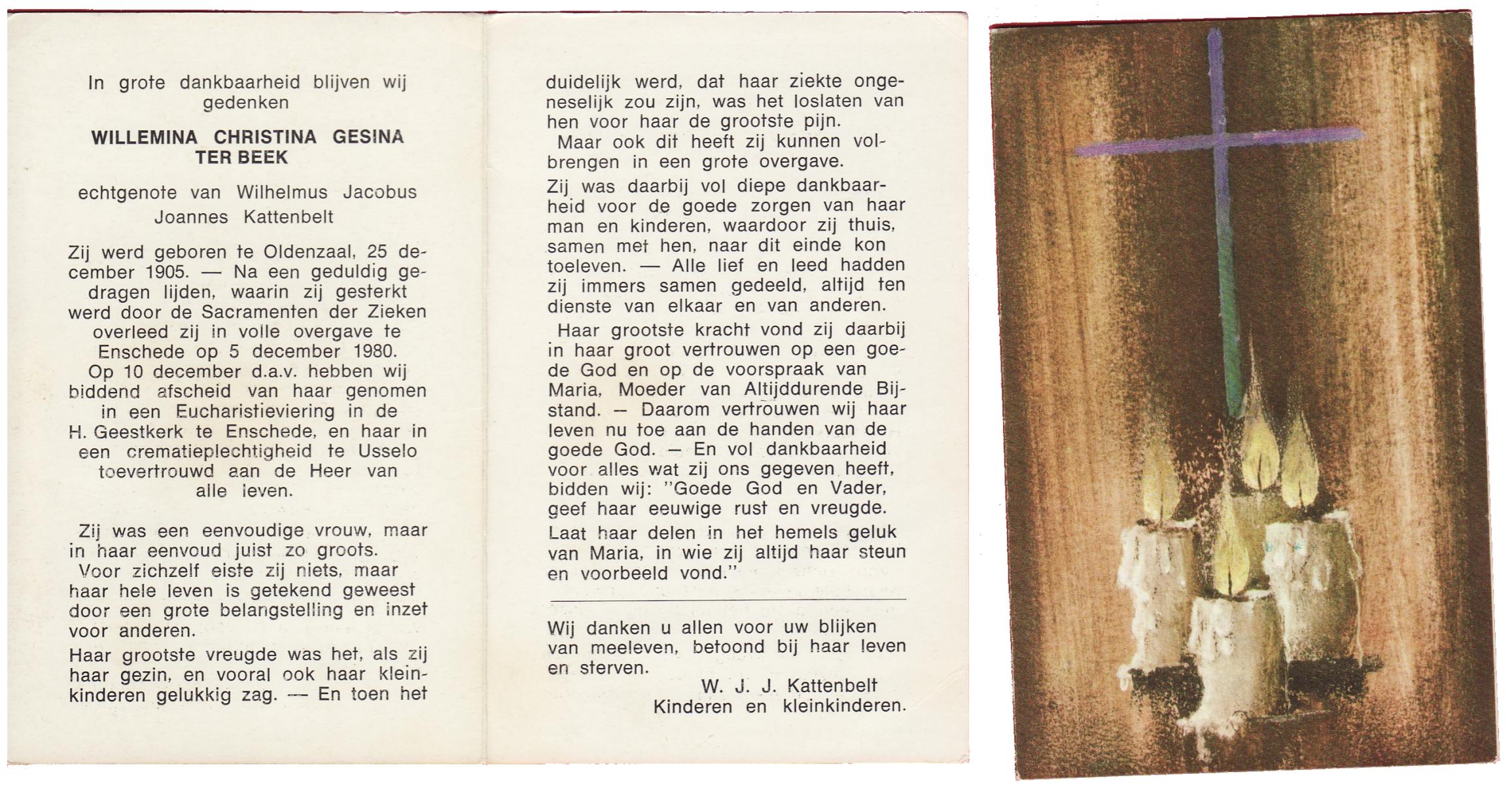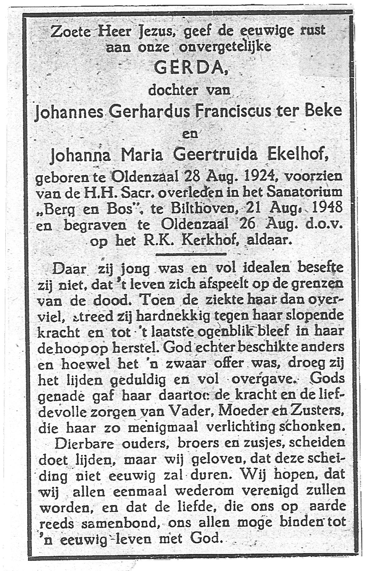 BEKE, ter, Gerda, geboren op 28-8-1924 te Oldenzaal, overleden op 21-8-1948 te Bilthoven op 23-jarige leeftijd, begraven op 26-8-1948 te Oldenzaal.
