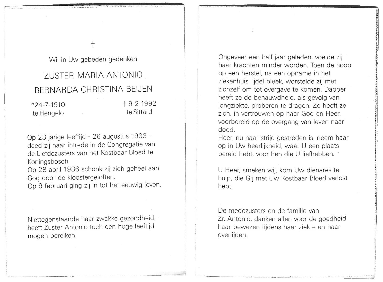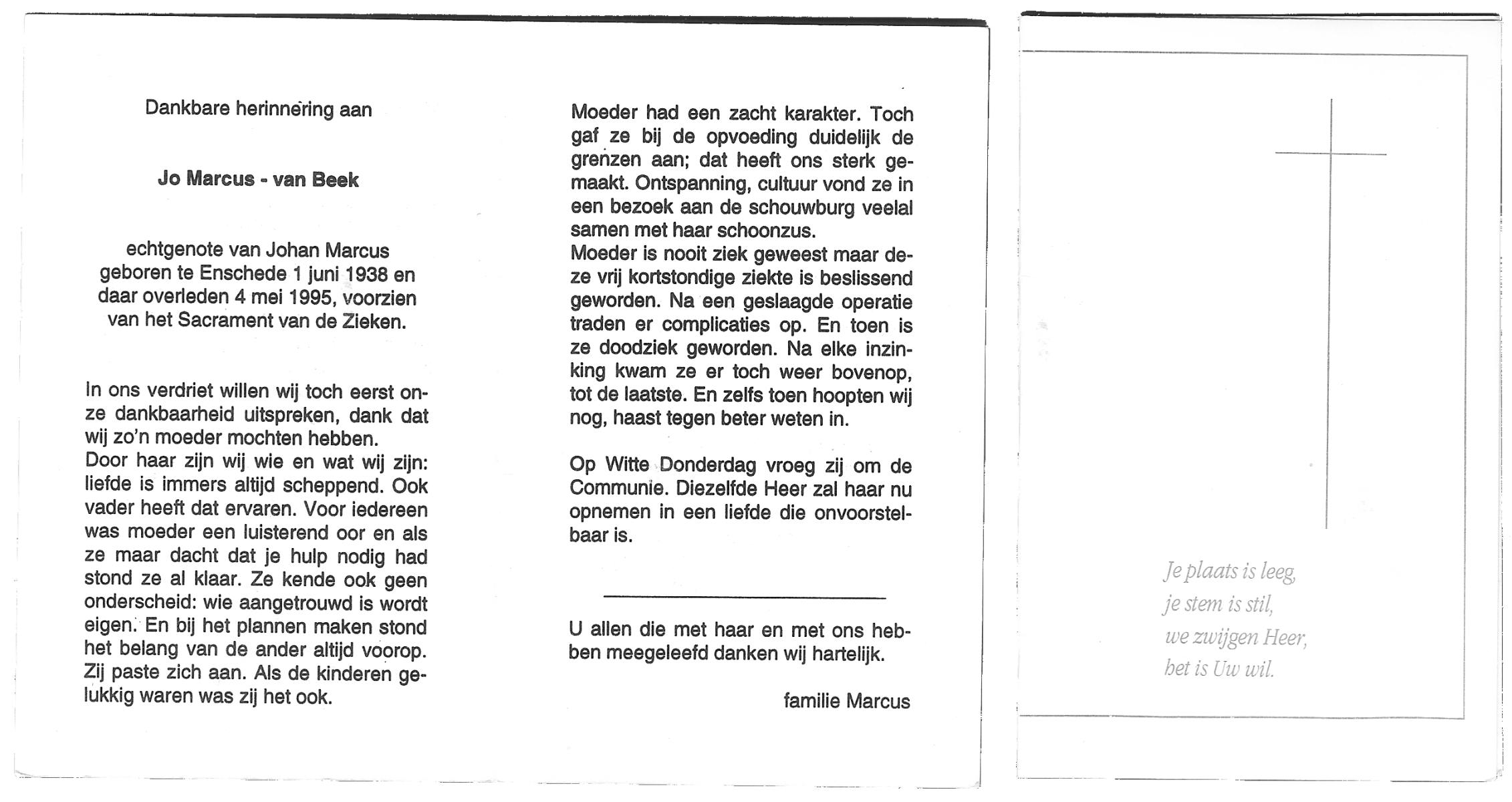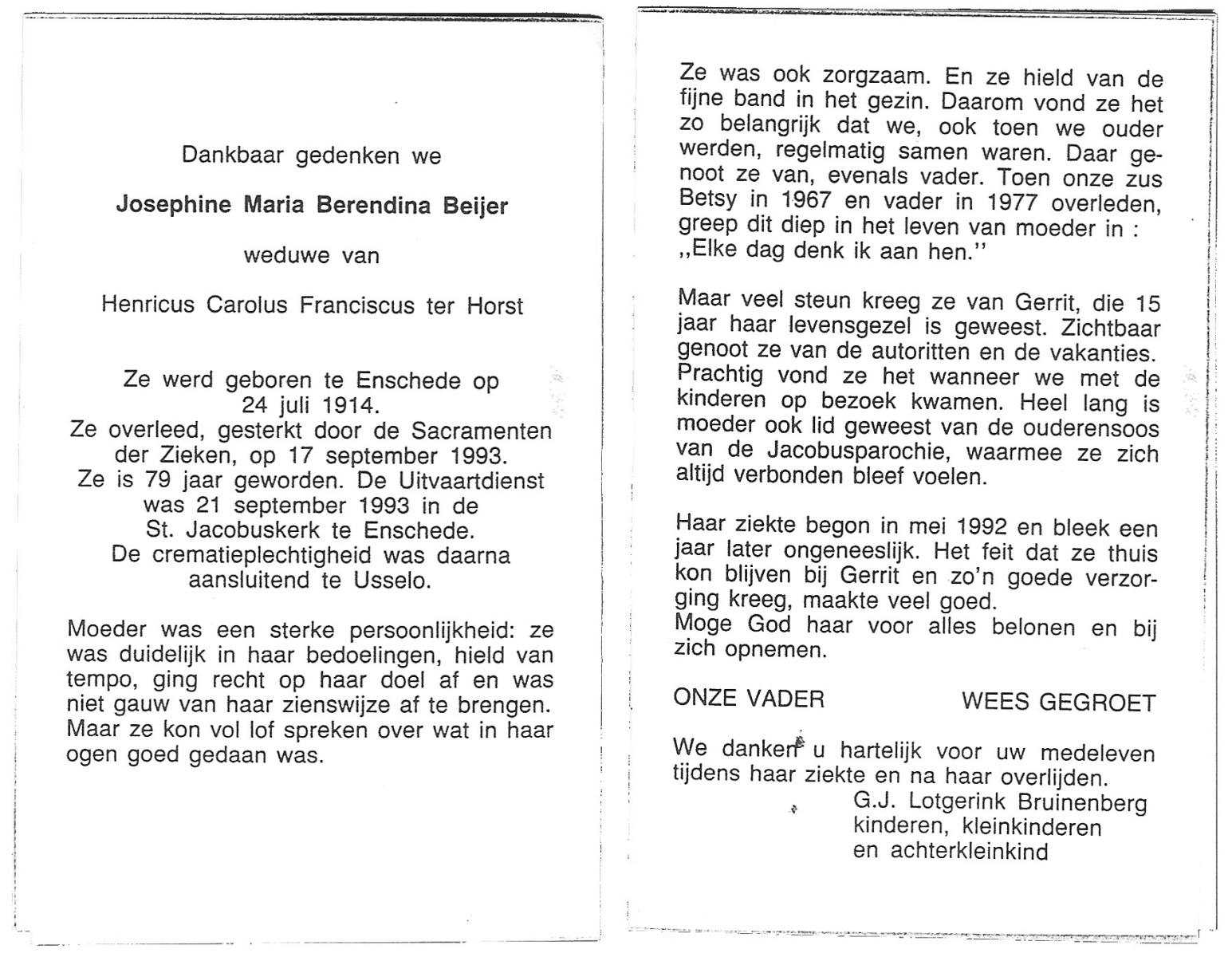 BEIJER, Josephine Maria Berendina, geboren op 24-7-1914 te Enschede, overleden op 17-9-1993 op 79-jarige leeftijd, gecremeerd op 21-9-1993 te Usselo.
