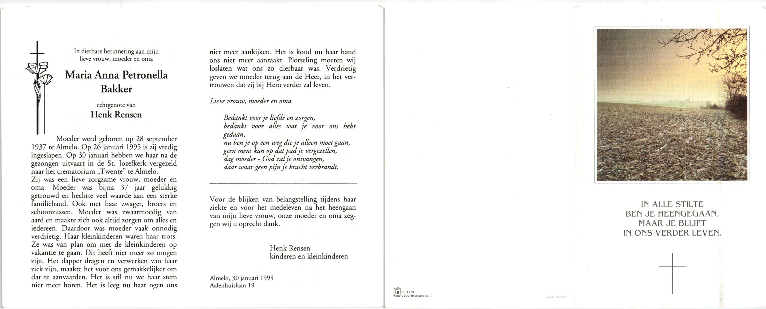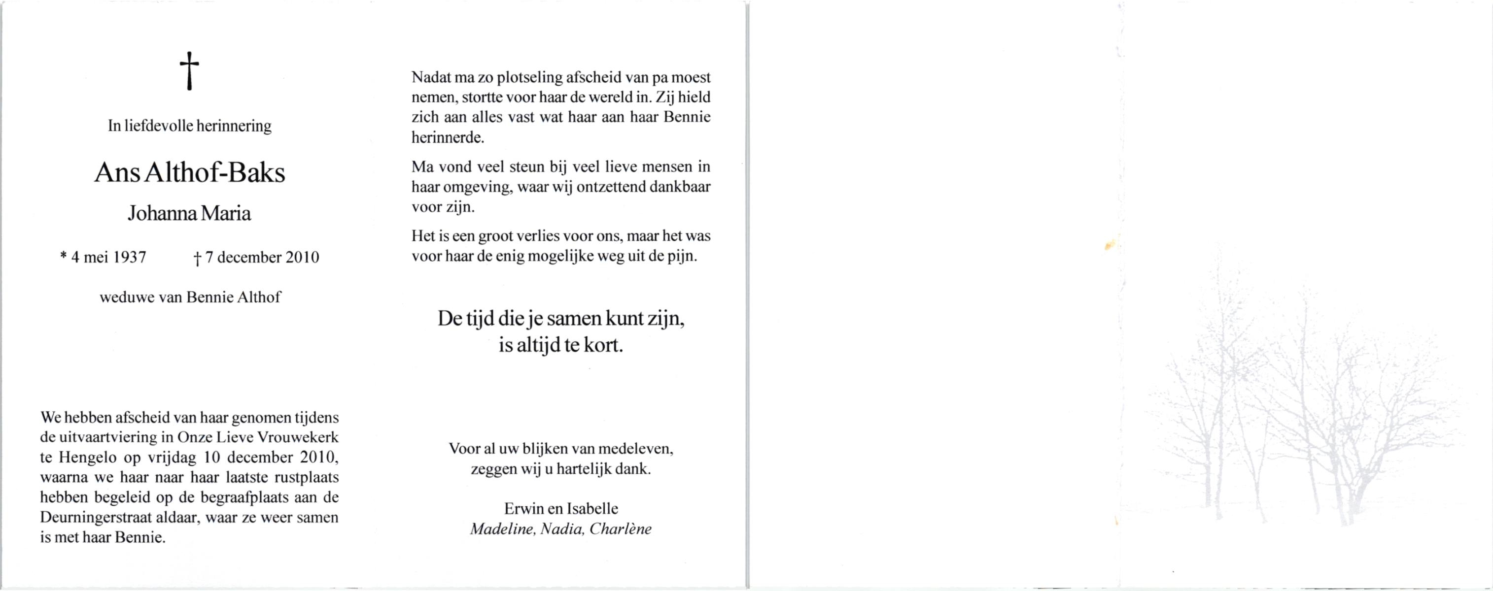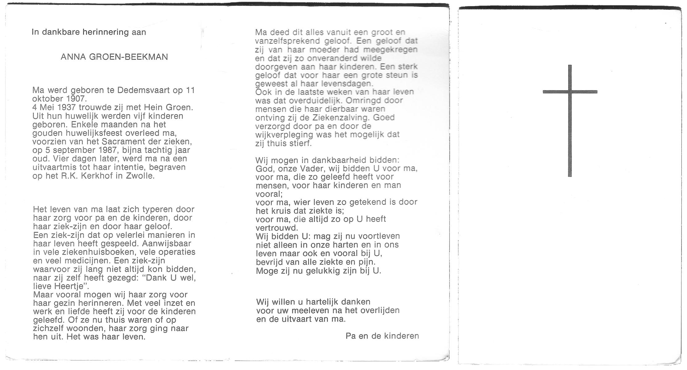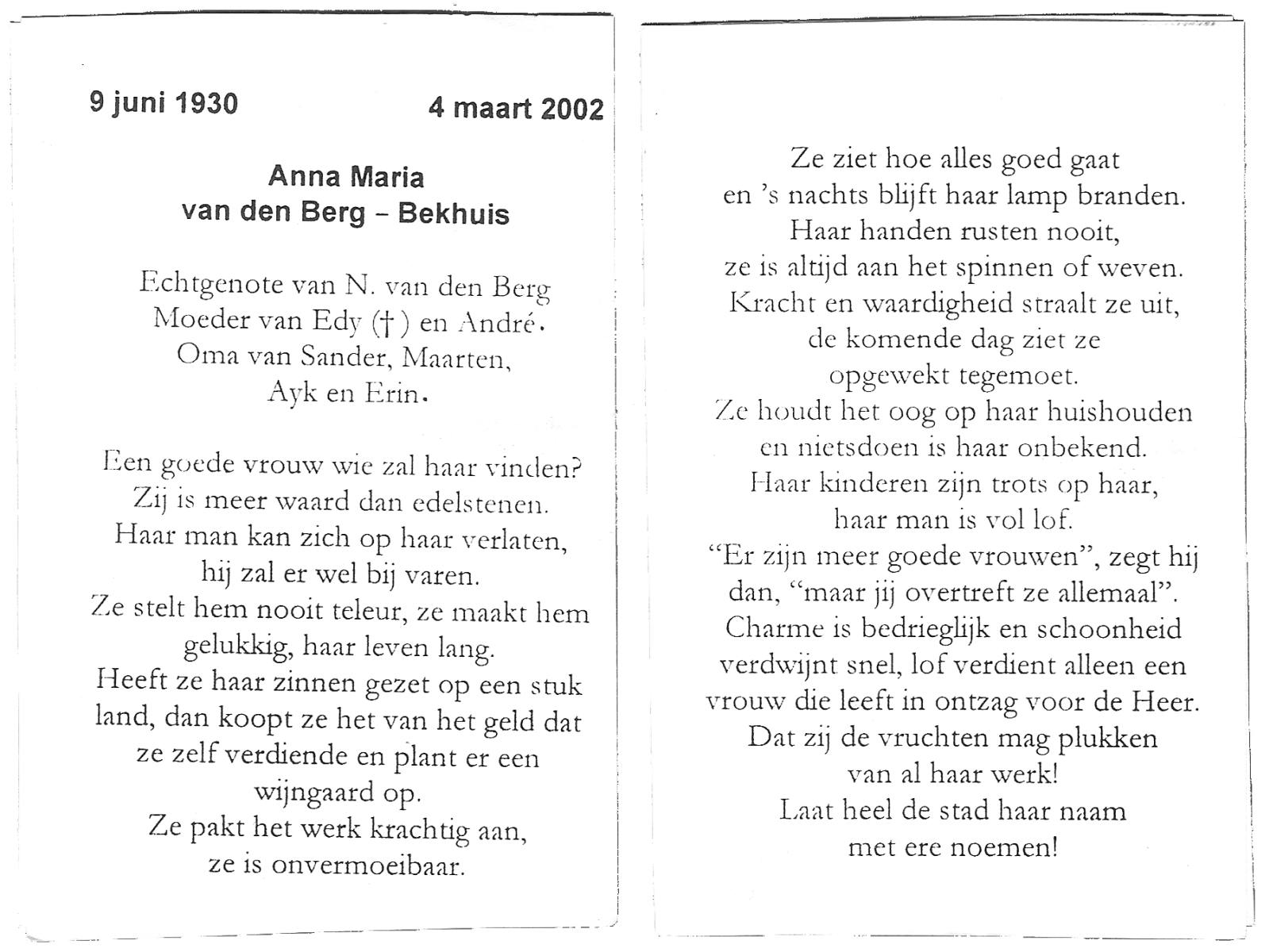 BEKHUIS, Anna Maria, geboren op 9-6-1930, overleden op 4-3-2002 op 71-jarige leeftijd.