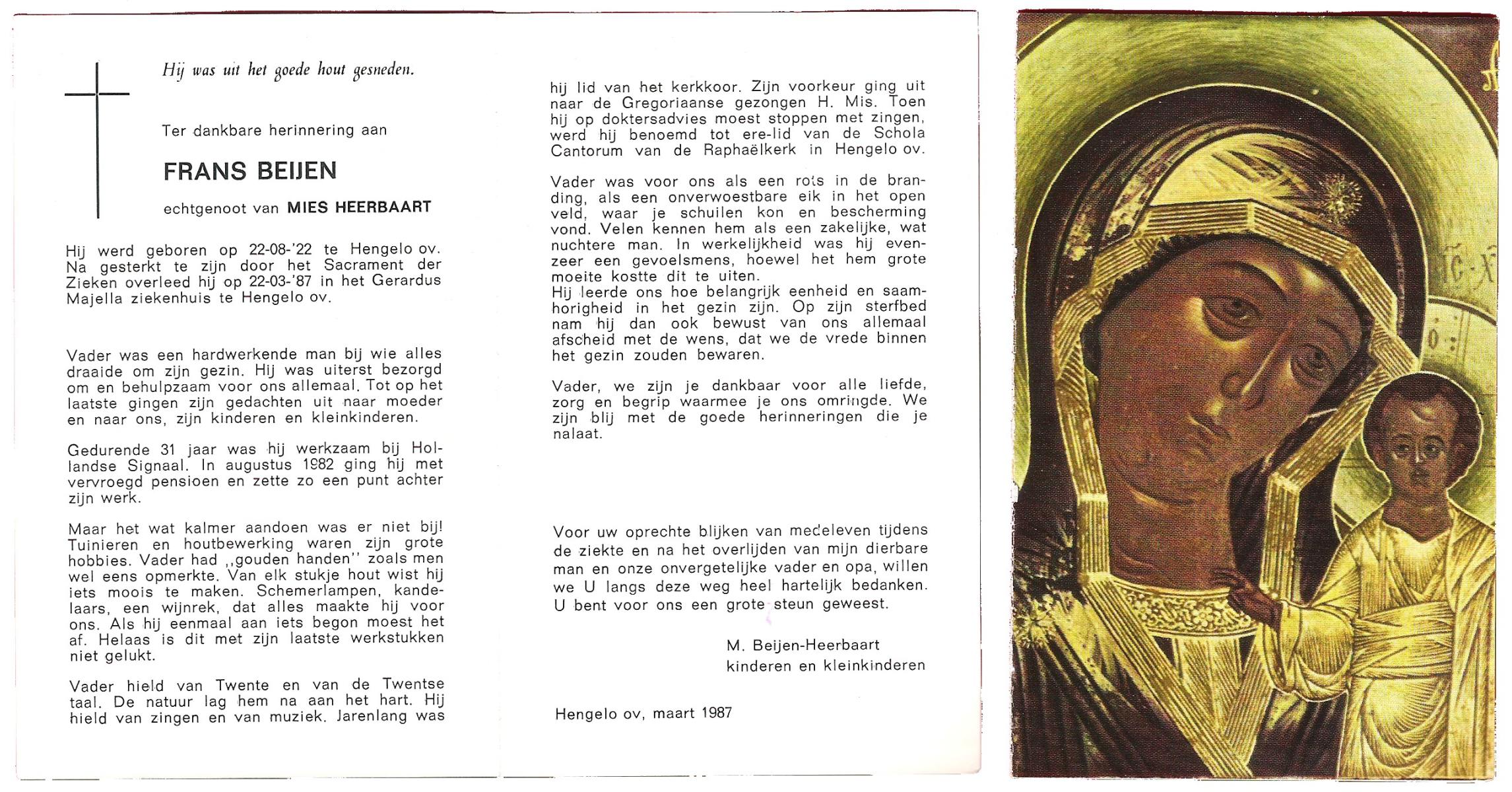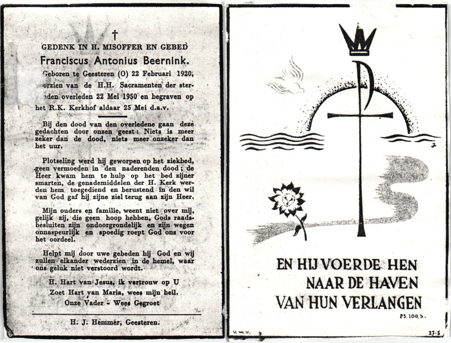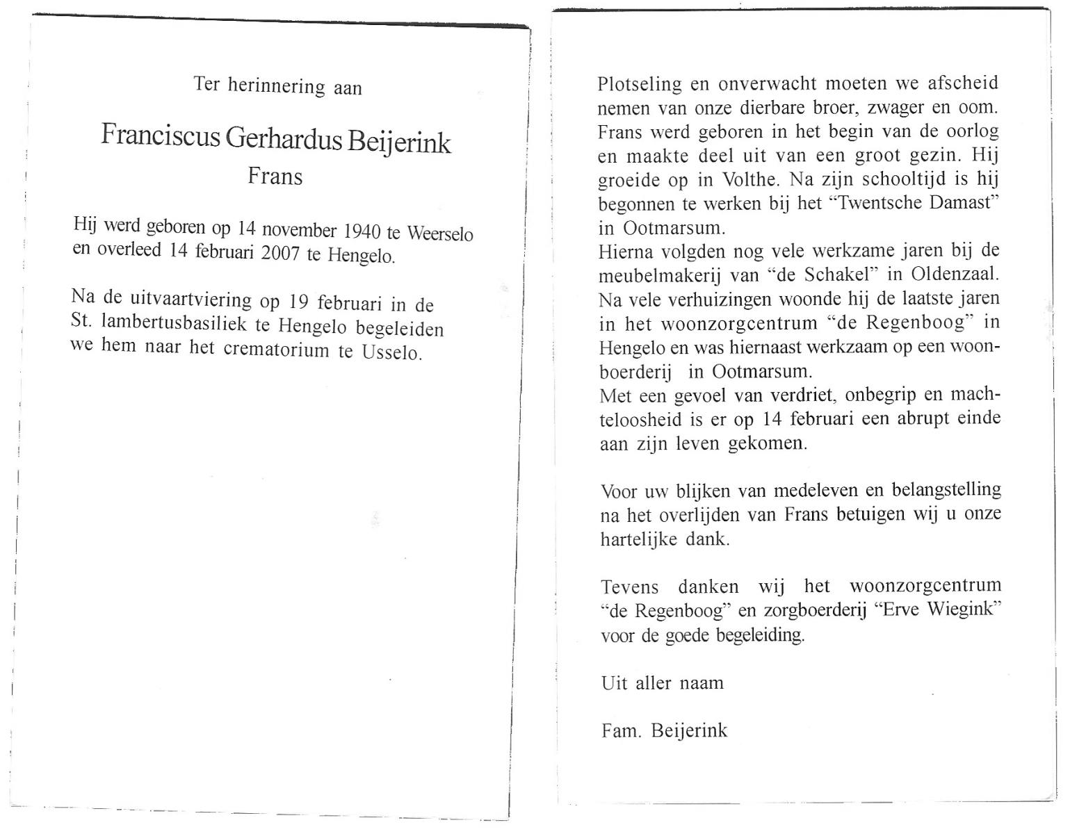 BEIJERINK, Franciscus Gerhardus (Frans), geboren op 14-11-1940 te Weerselo, overleden op 14-2-2007 te Hengelo (Ov.) op 66-jarige leeftijd, gecremeerd op 19-2-2007 te Usselo.