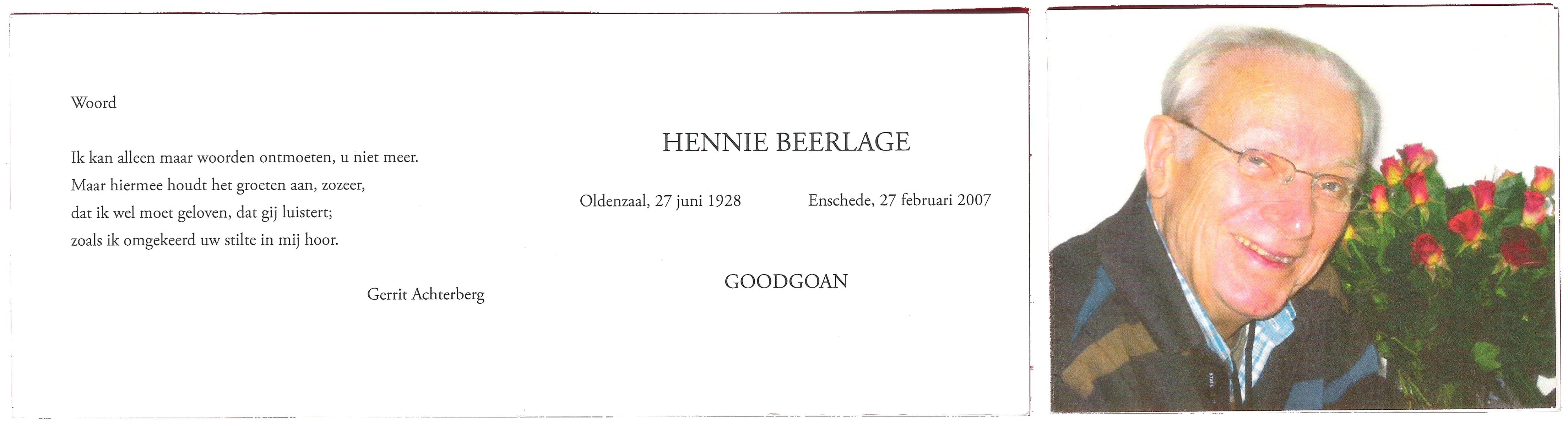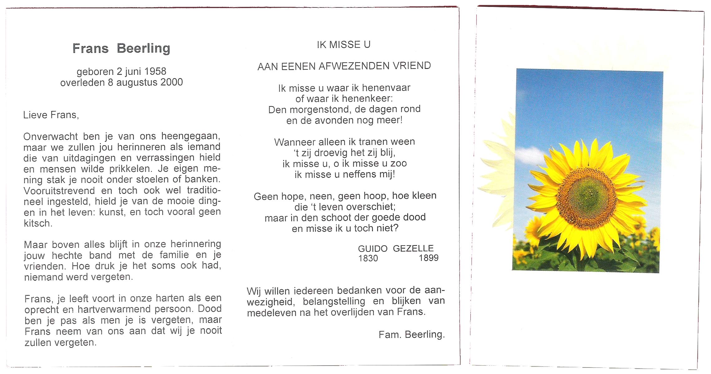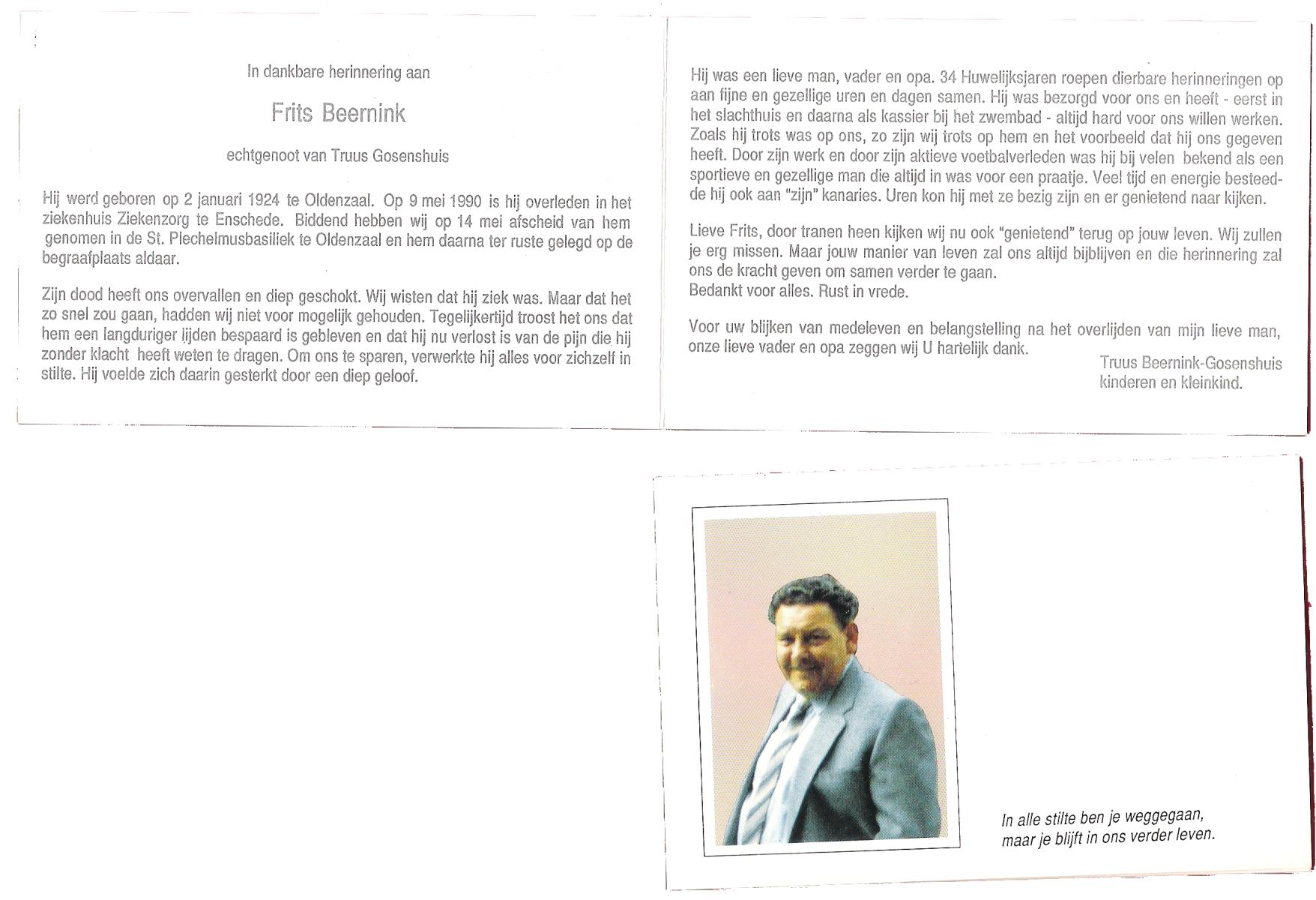 BEIJERINK, Franciscus Gerhardus (Frans), geboren op 14-11-1940 te Weerselo, overleden op 14-2-2007 te Hengelo (Ov.) op 66-jarige leeftijd, gecremeerd op 19-2-2007 te Usselo.