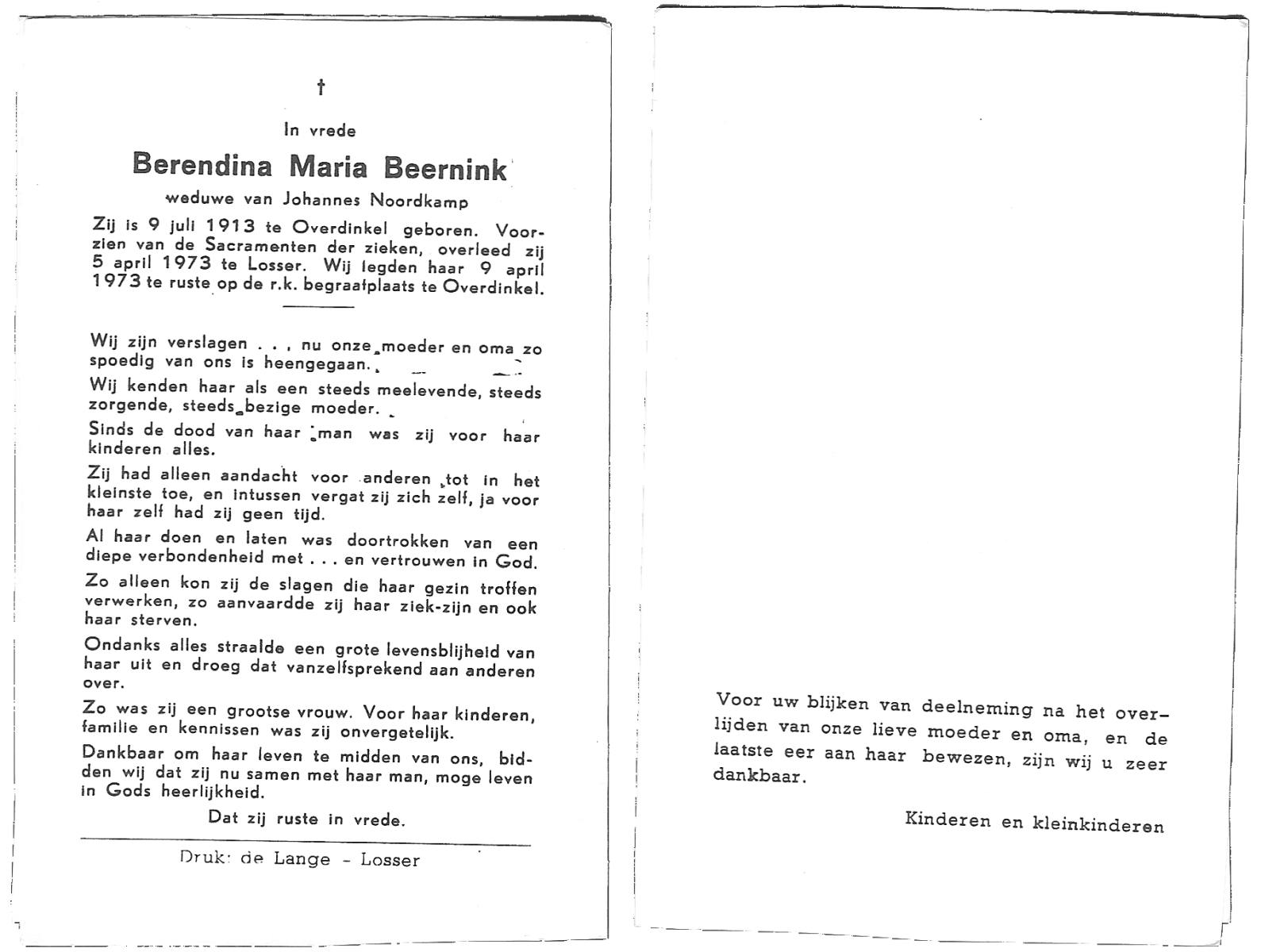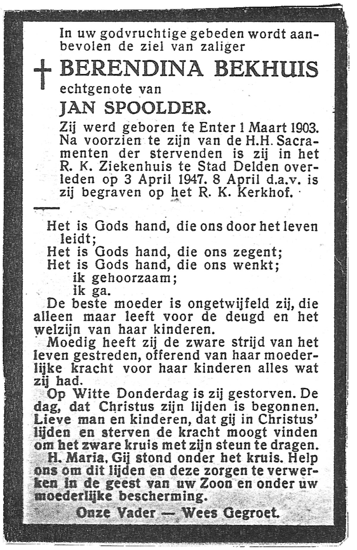 BEKHUIS, Berendina, geboren op 1-3-1903 te Enter, overleden op 3-4-1947 te Delden, Stad op 44-jarige leeftijd, begraven op 8-4-1947 te Delden.