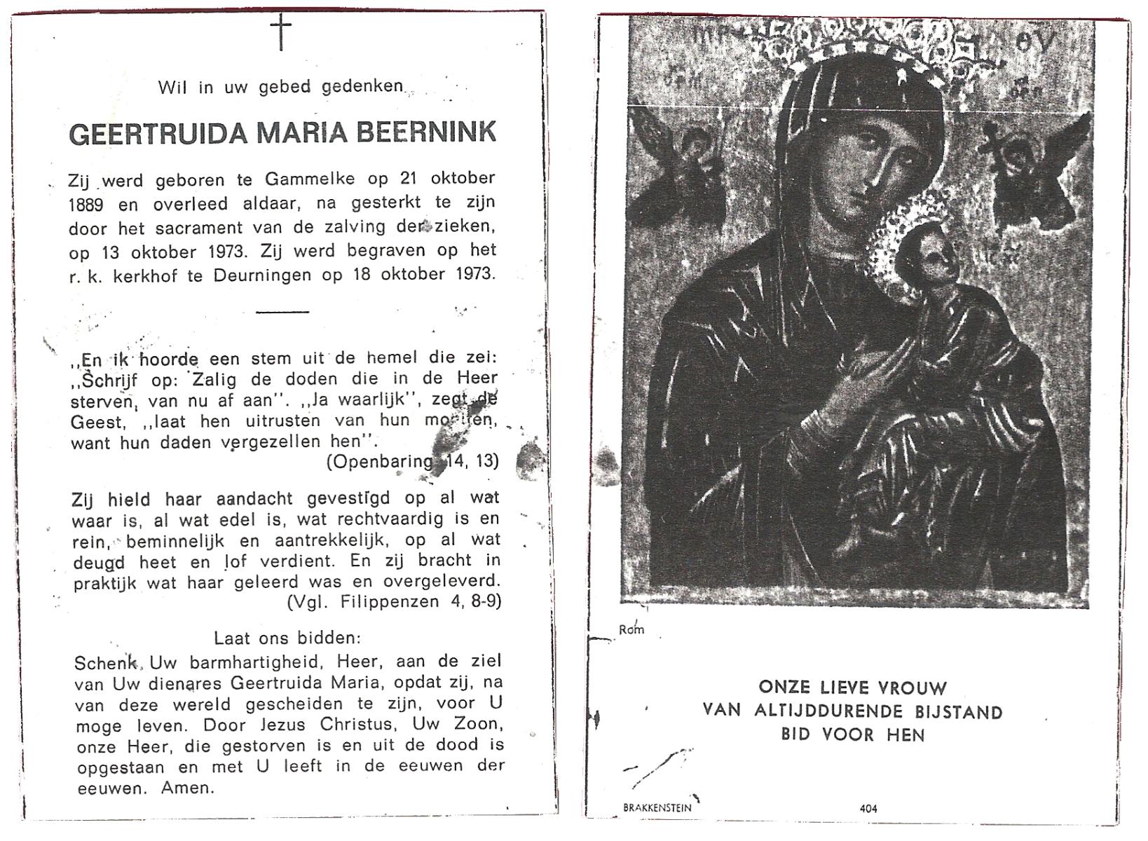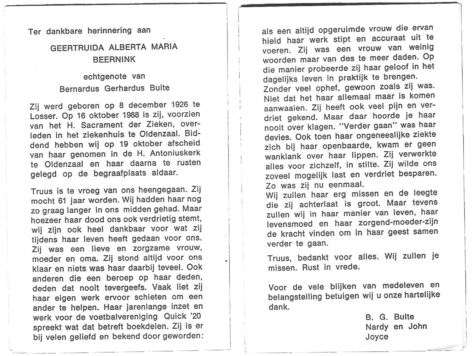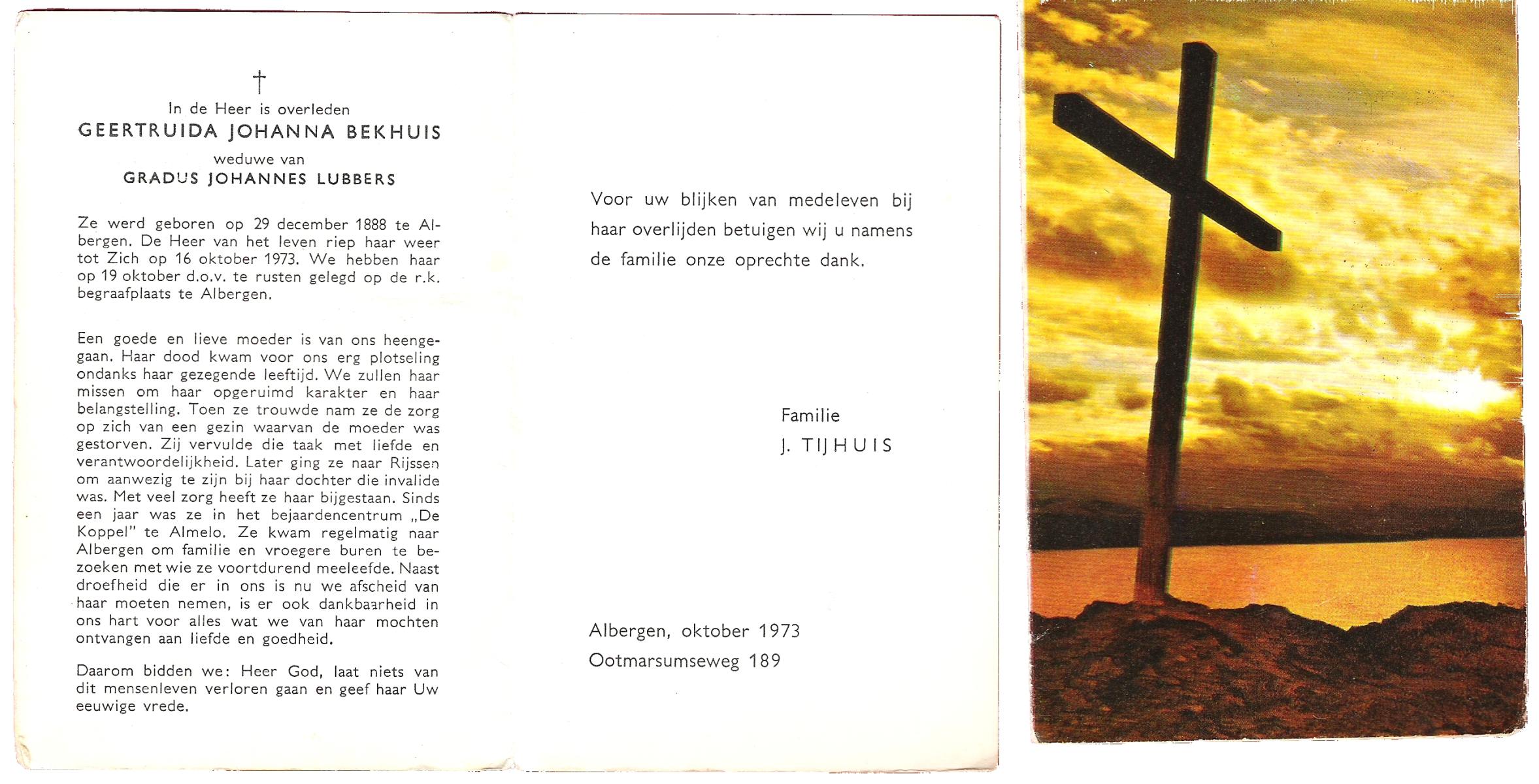 BEKHUIS, Geertruida Johanna, geboren op 29-12-1888 te Albergen, overleden op 16-10-1973 op 84-jarige leeftijd, begraven op 19-10-1973 te Albergen.