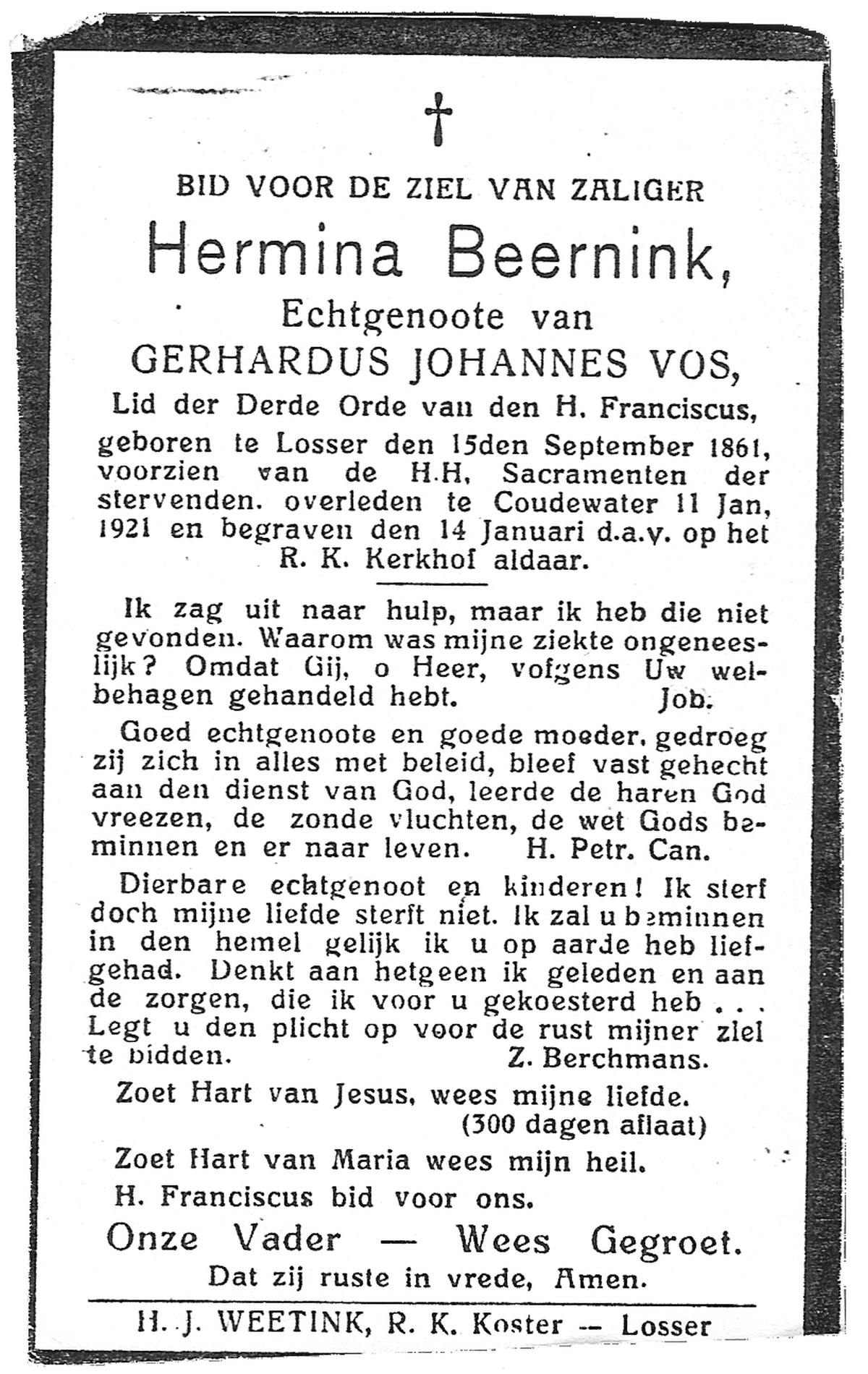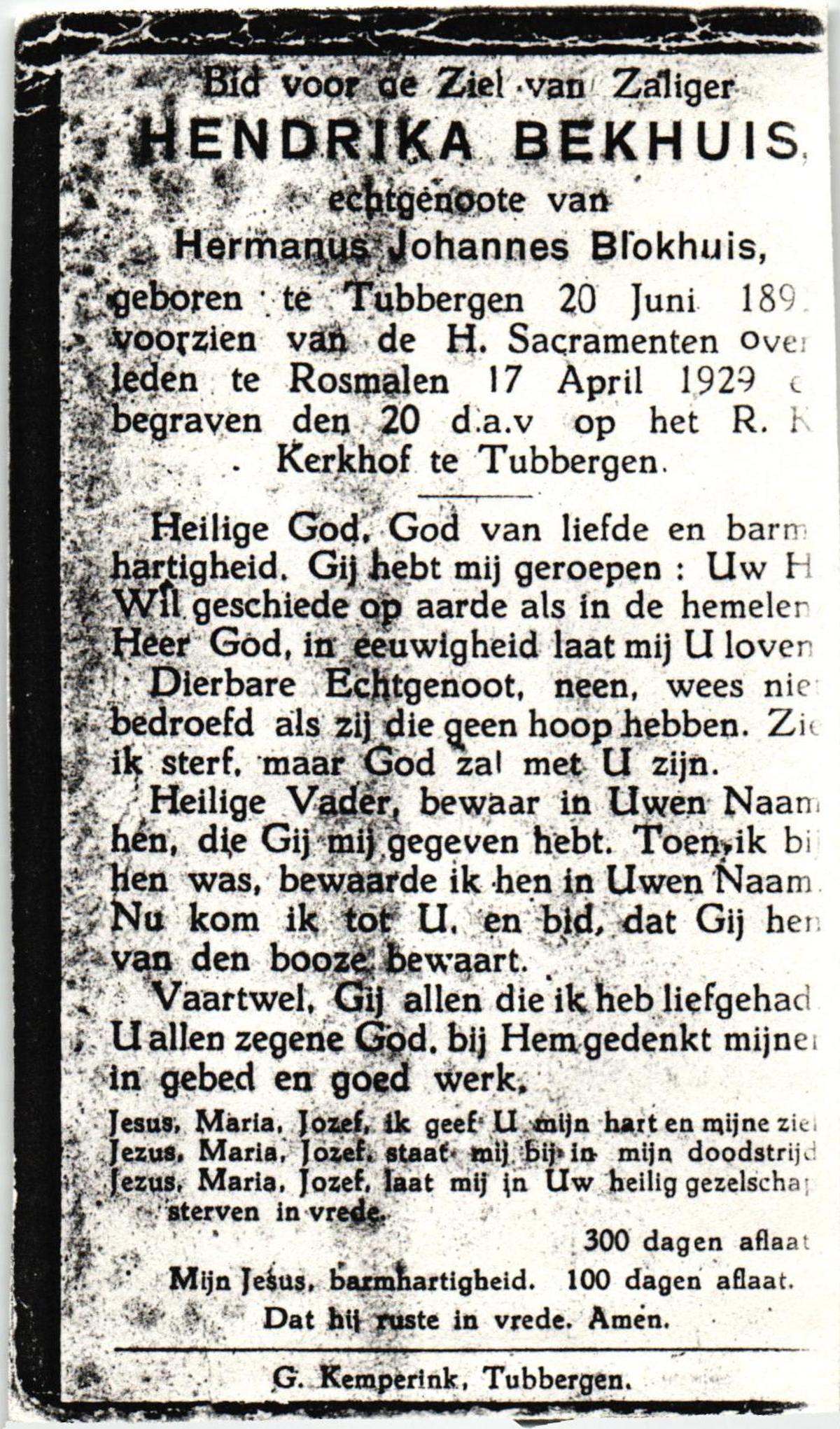 BEKHUIS, Hendrika, geboren op 20-06-1891 te Tubbergen, overleden op 17-4-1929 te Rosmalen op 37-jarige leeftijd, begraven op 20-4-1929 te Tubbergen.