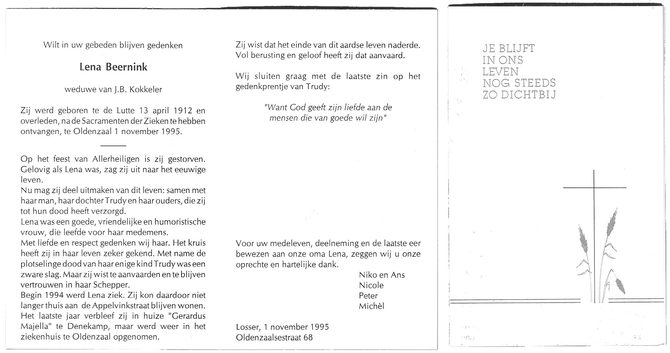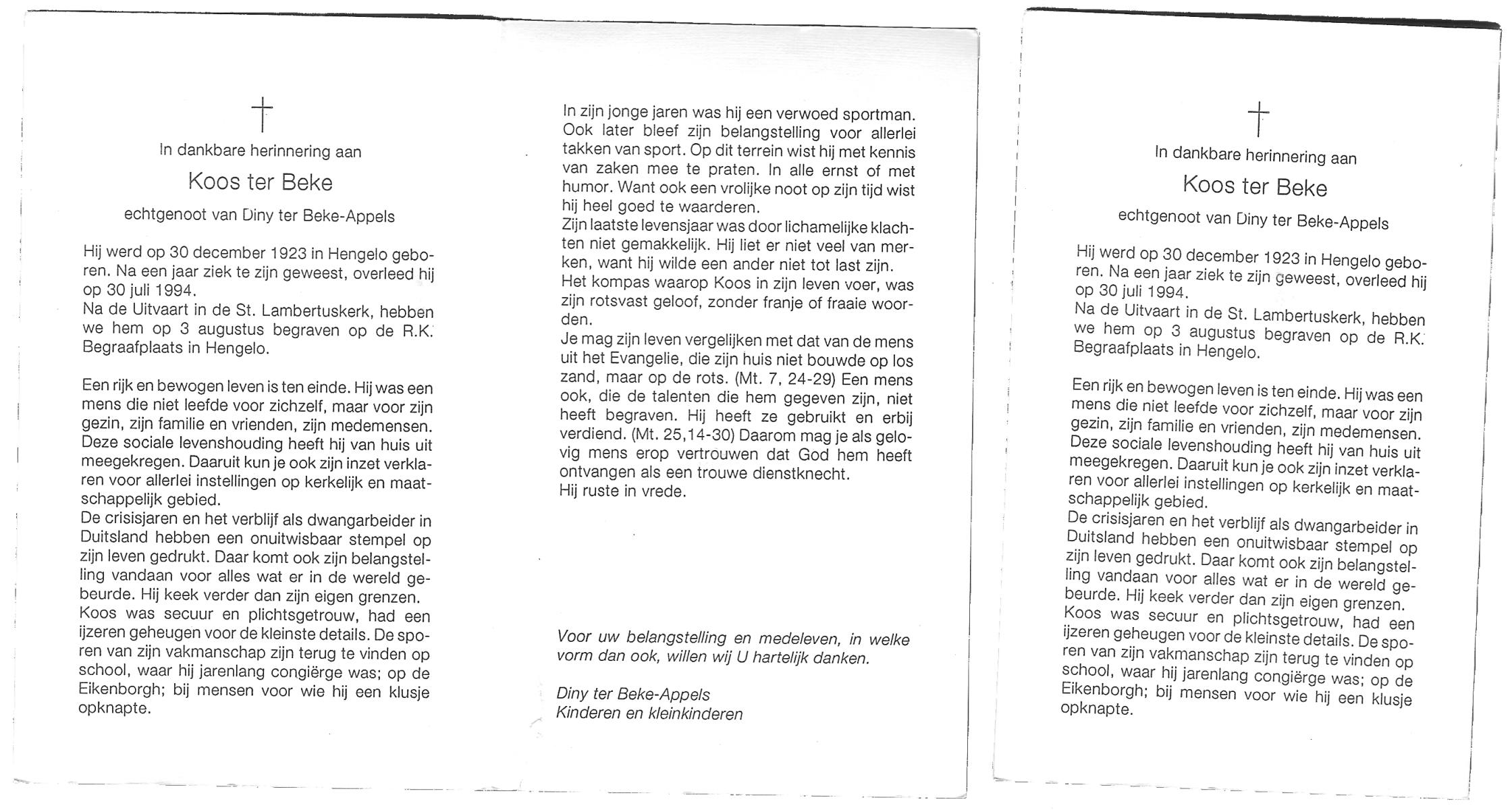 BEKE, ter, Koos, geboren op 30-12-1923 te Hengelo (O), overleden op 30-7-1994 te Hengelo (Ov.) op 70-jarige leeftijd, begraven op 3-8-1994 te Hengelo (Ov.).