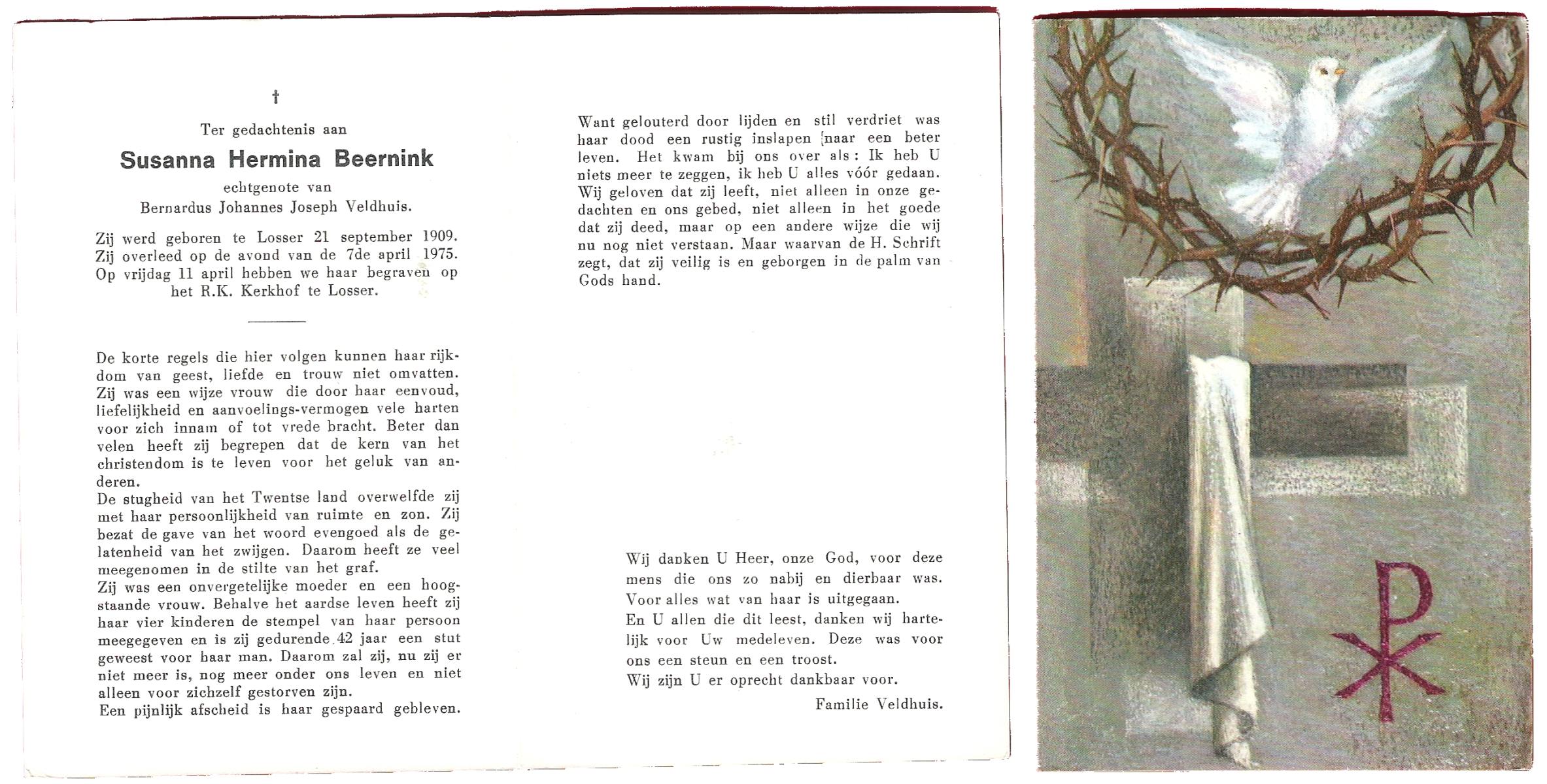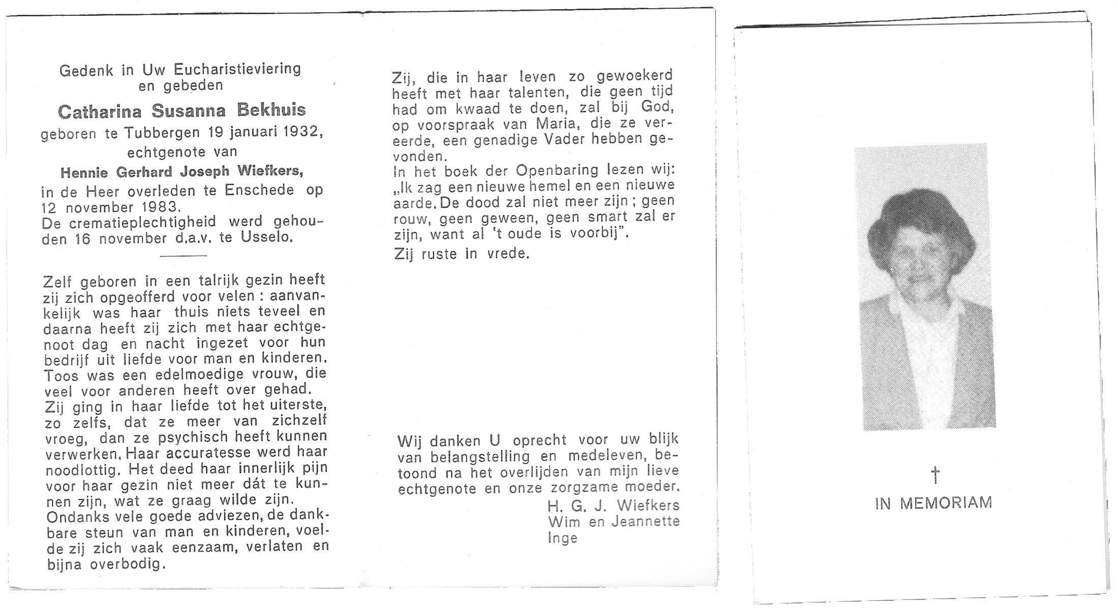 BEKHUIS, Catharina Susanna, geboren op 19-1-1932 te Tubbergen, overleden op 12-11-1983 te Enschede op 51-jarige leeftijd, gecremeerd op 16-11-1983 te Usselo.