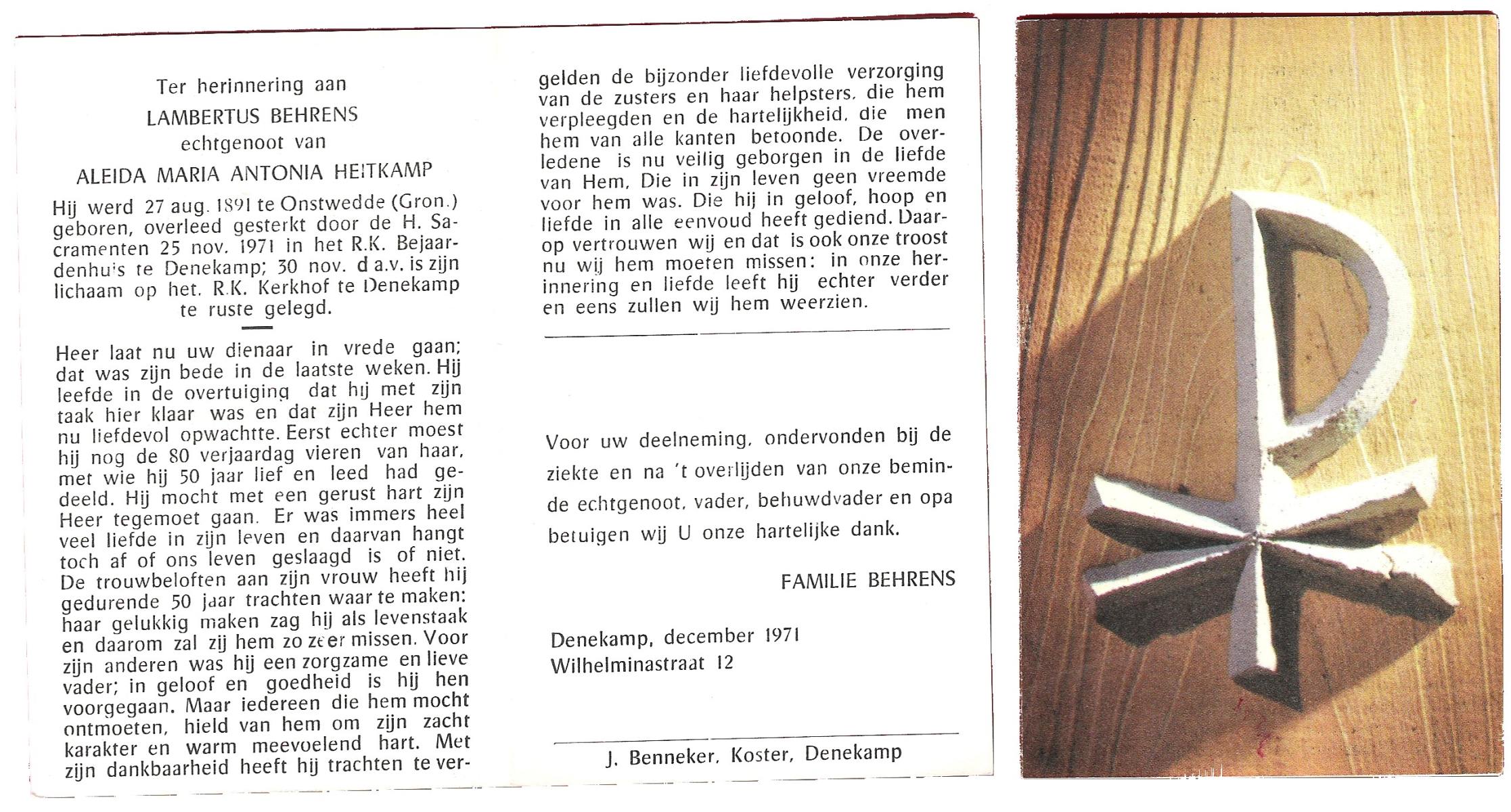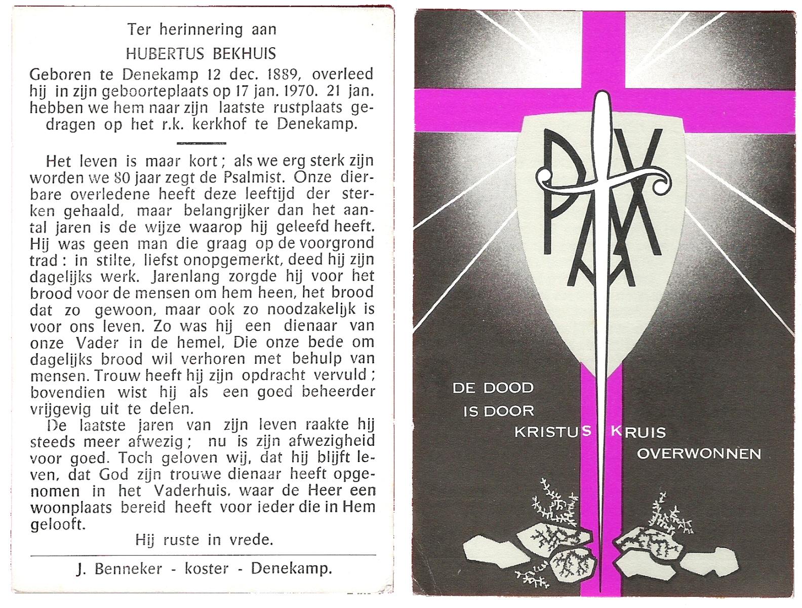 BEKHUIS, Hubertus, geboren op 12-12-1889 te Denekamp, overleden op 17-1-1970 te Denekamp op 81-jarige leeftijd, begraven op 21-1-1970 te Denekamp.