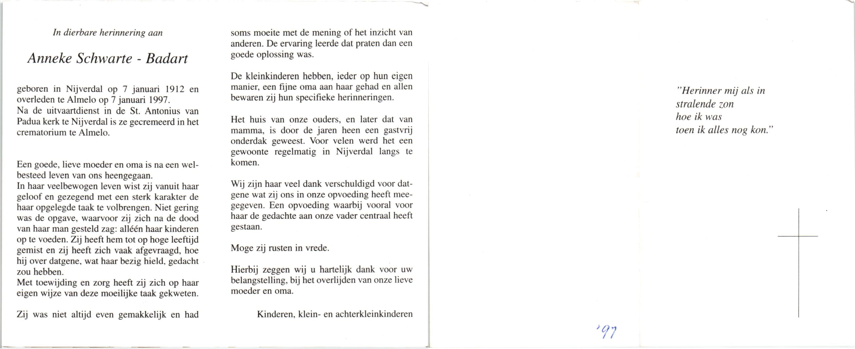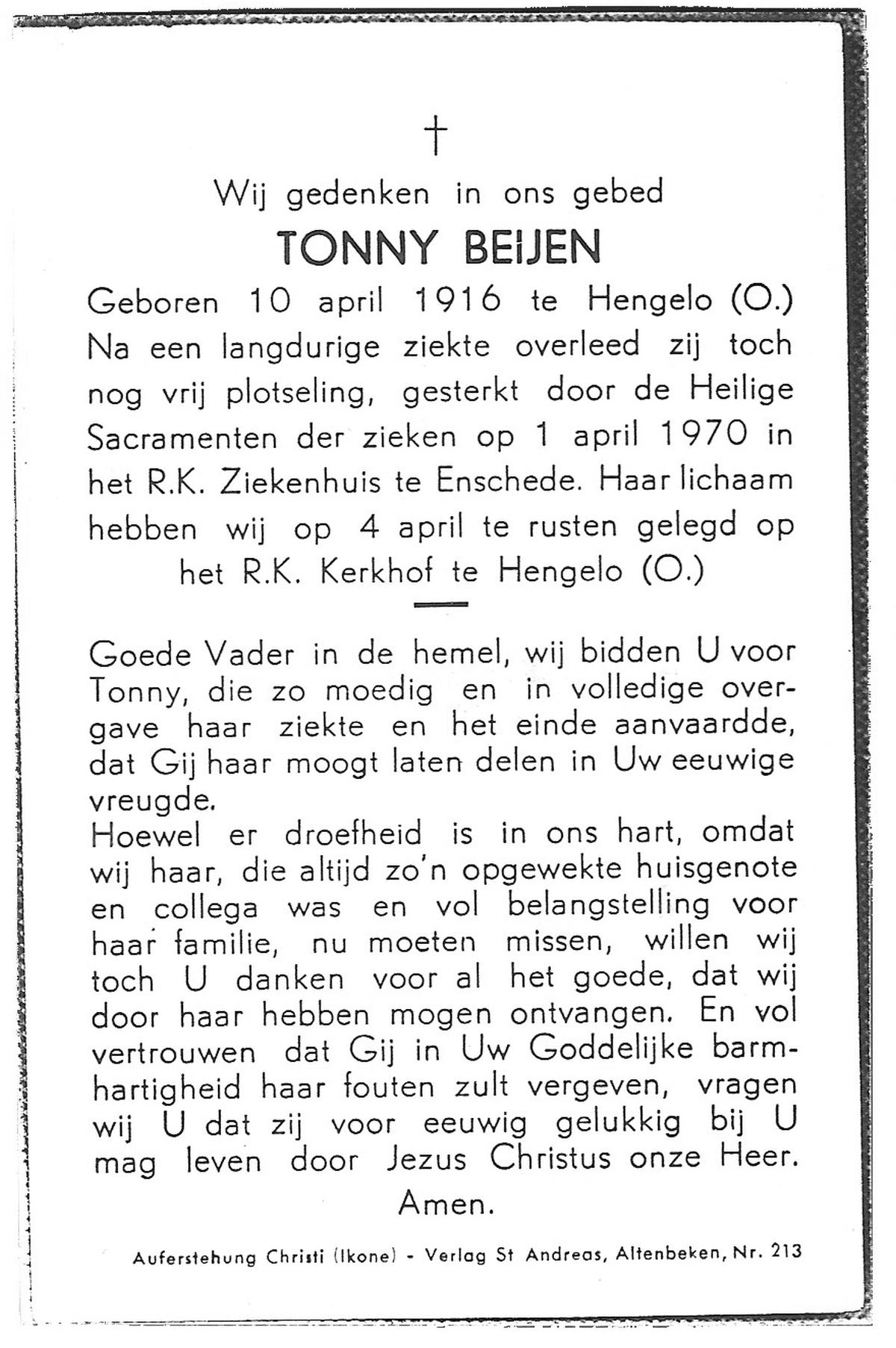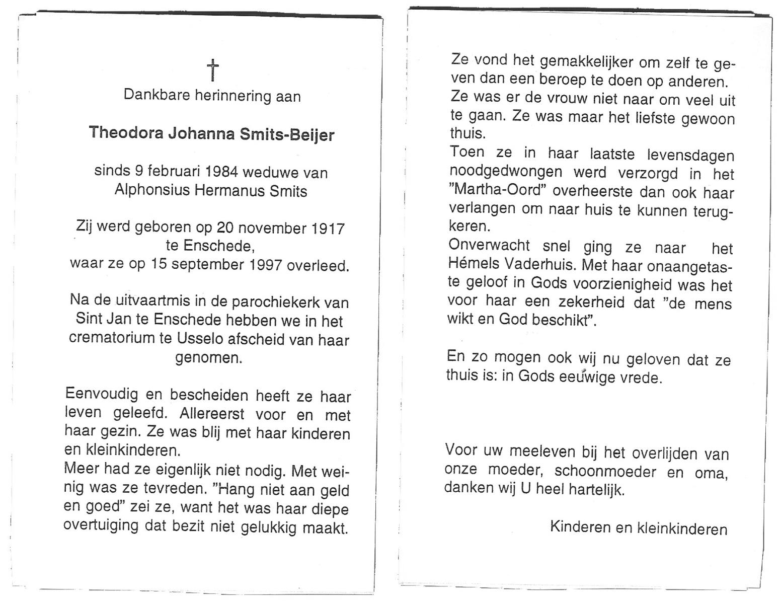 BEIJER, Theodora Johanna, geboren op 20-11-1917 te Enschede, overleden op 15-9-1997 te Enschede op 79-jarige leeftijd, gecremeerd te Usselo.