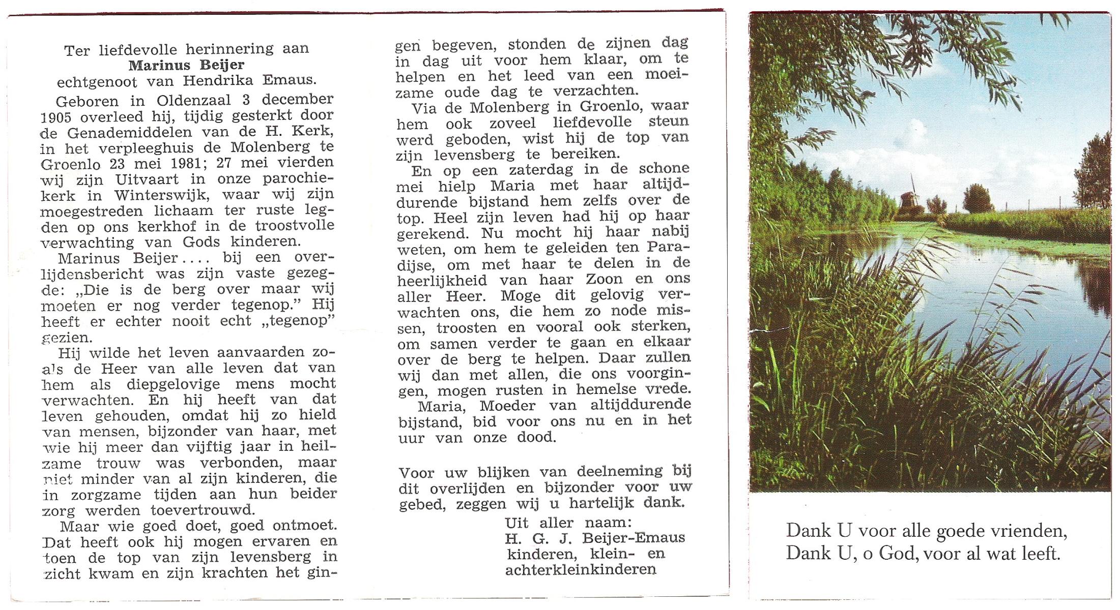 BEIJER, Marinus, geboren op 3-12-1905 te Oldenzaal, overleden op 23-5-1981 te Groenlo op 75-jarige leeftijd, begraven op 27-5-1981 te Winterswijk.