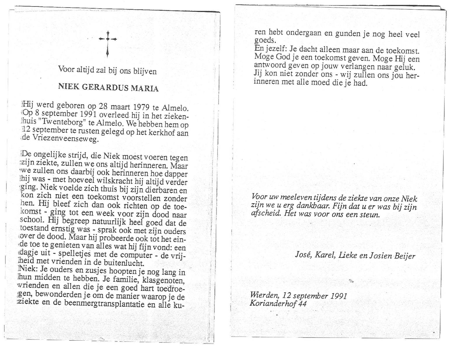 BEIJER, Niek Gerardus Maria, geboren op 28-3-1979 te Almelo, overleden op 8-9-1991 te Almelo op 12-jarige leeftijd, begraven op 12-9-1991 te Wierden.