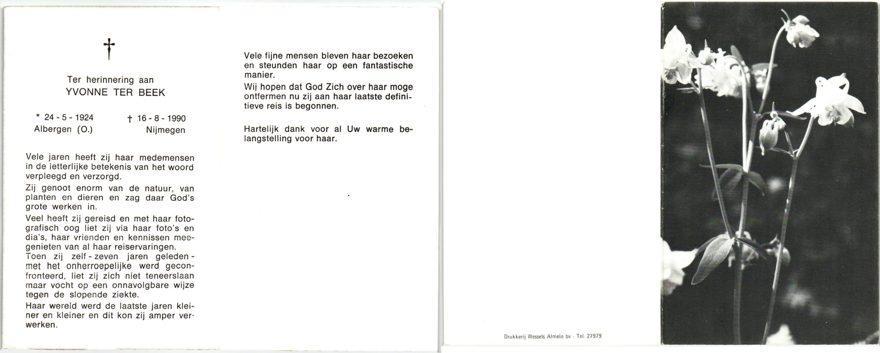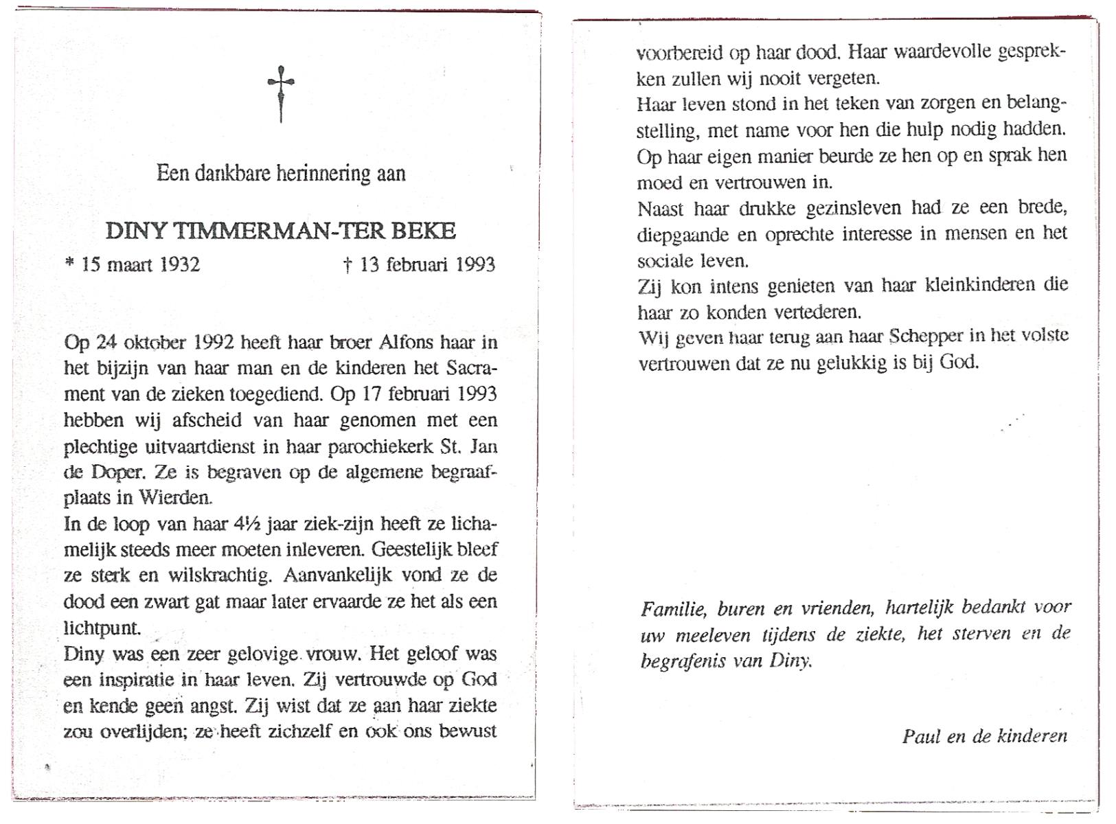 BEKE, ter, Diny, geboren op 15-3-1932 te Wierden, overleden op 13-2-1993 op 59-jarige leeftijd, begraven op 17-2-1993 te Wierden.