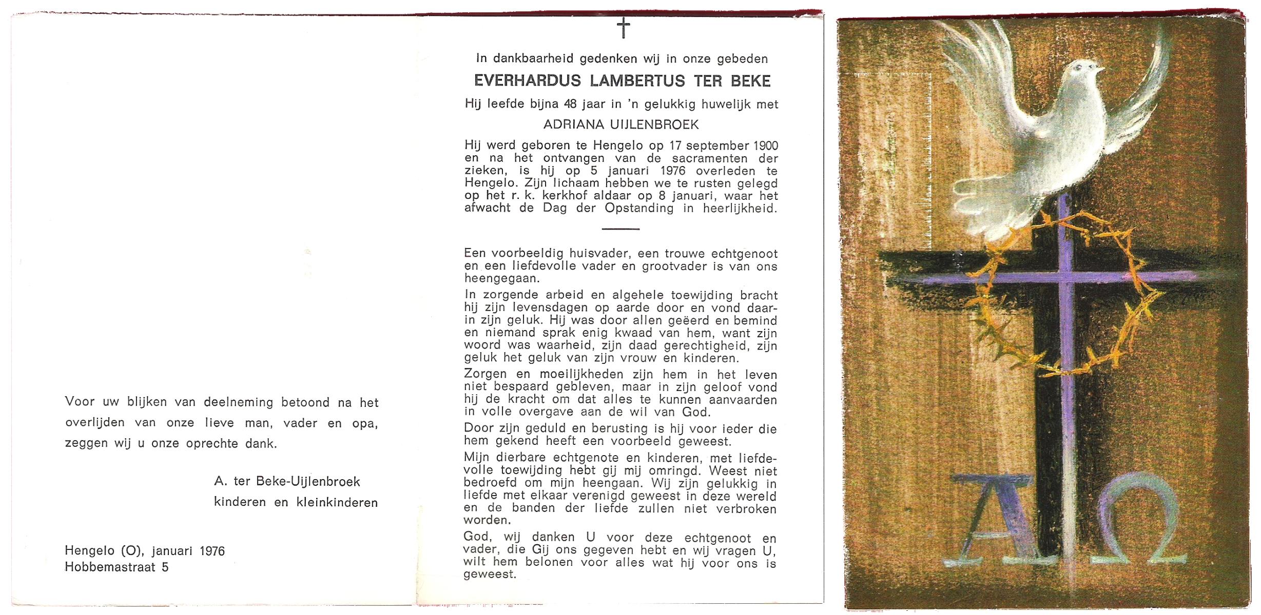 BEKE, ter, Everhardus Lambertus, geboren op 17-9-1900 te Hengelo (O), overleden op 5-1-1976 te Hengelo (Ov.) op 75-jarige leeftijd, begraven op 8-1-1976 te Hengelo (Ov.).