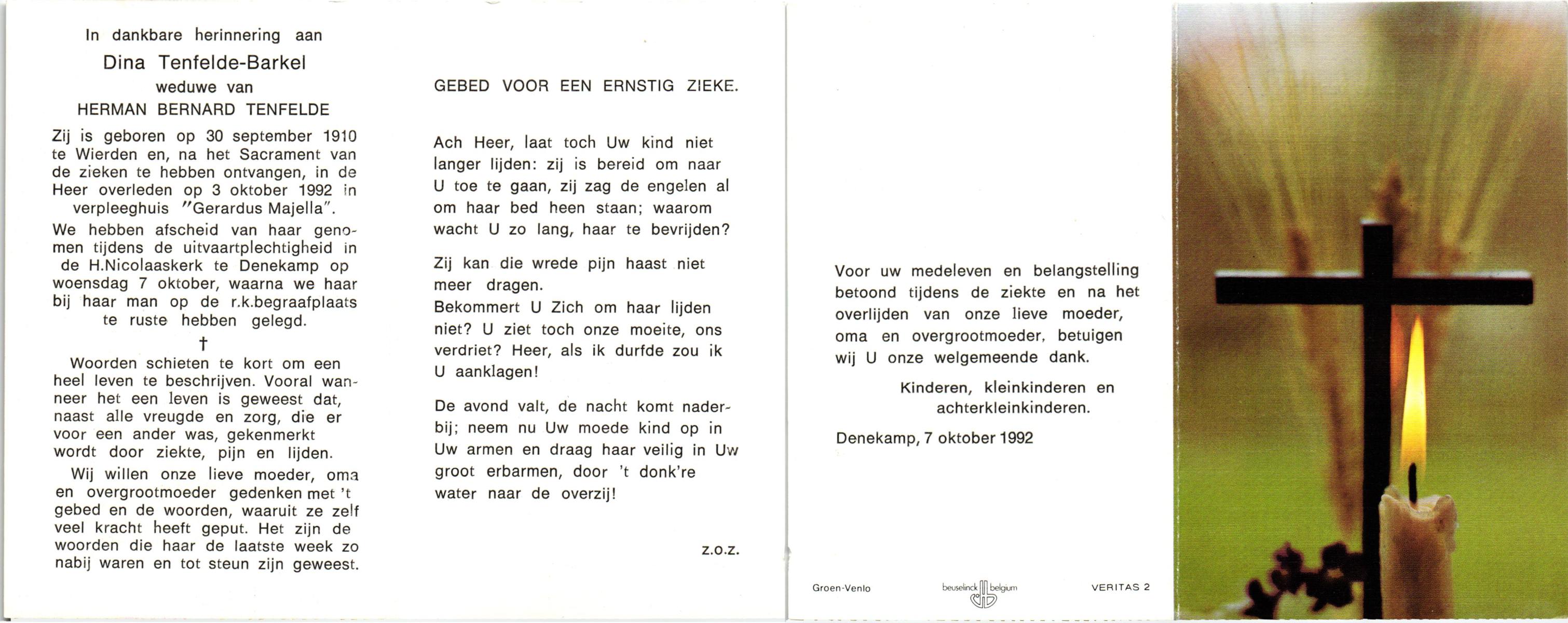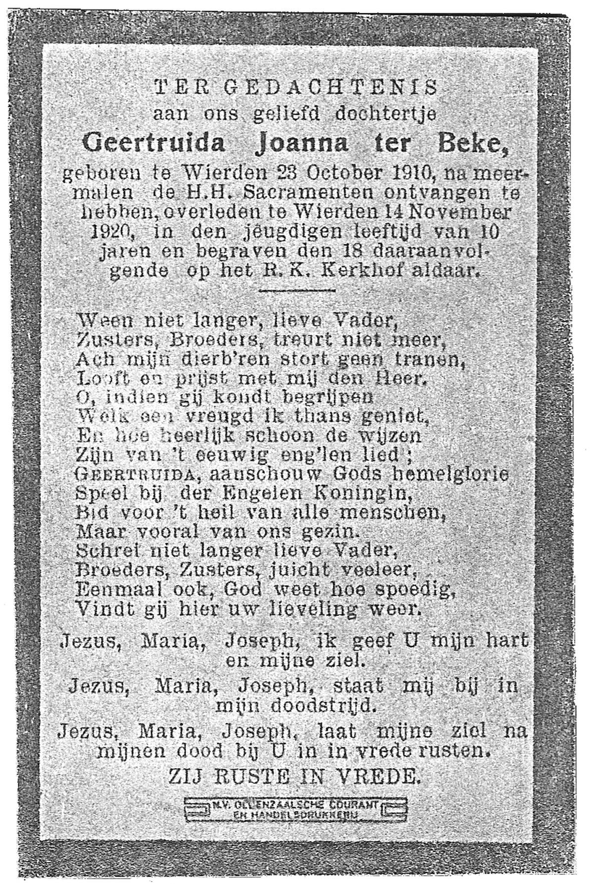 BEKE, ter, Geertruida Joanna, geboren op 23-10-1910 te Wierden, overleden op 14-11-1920 te Wierden op 10-jarige leeftijd, begraven op 18-11-1920 te Wierden.