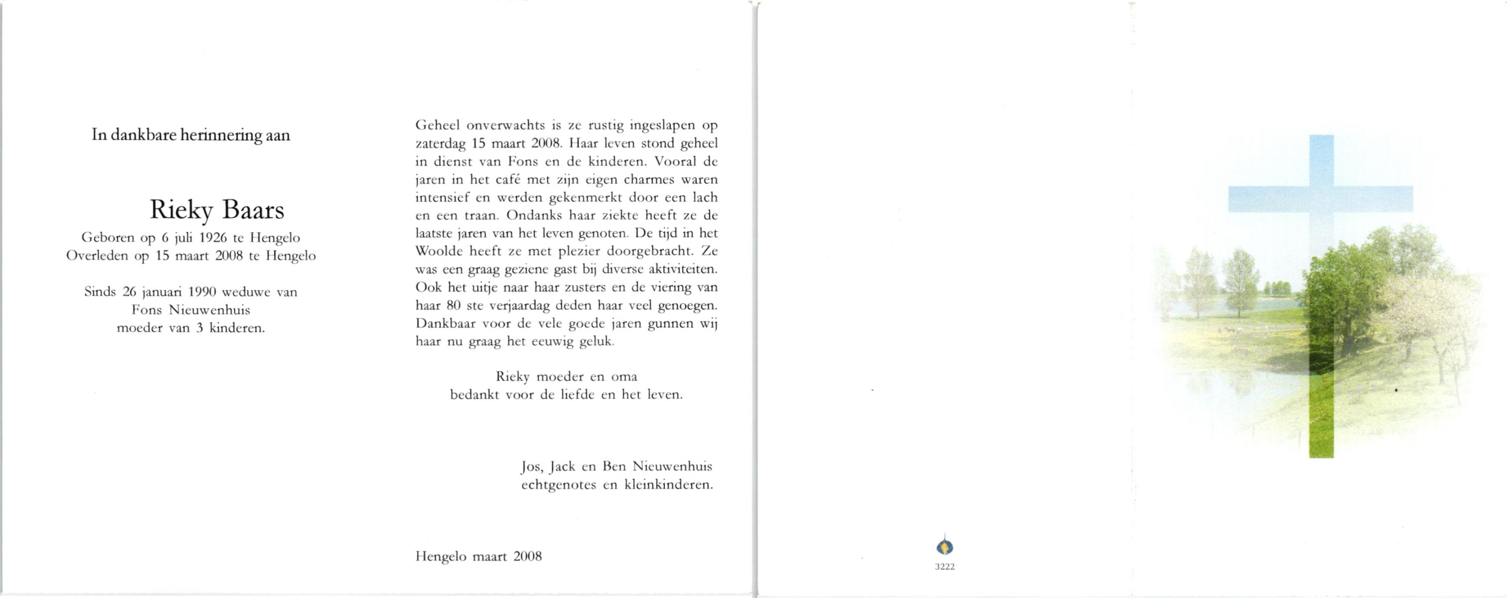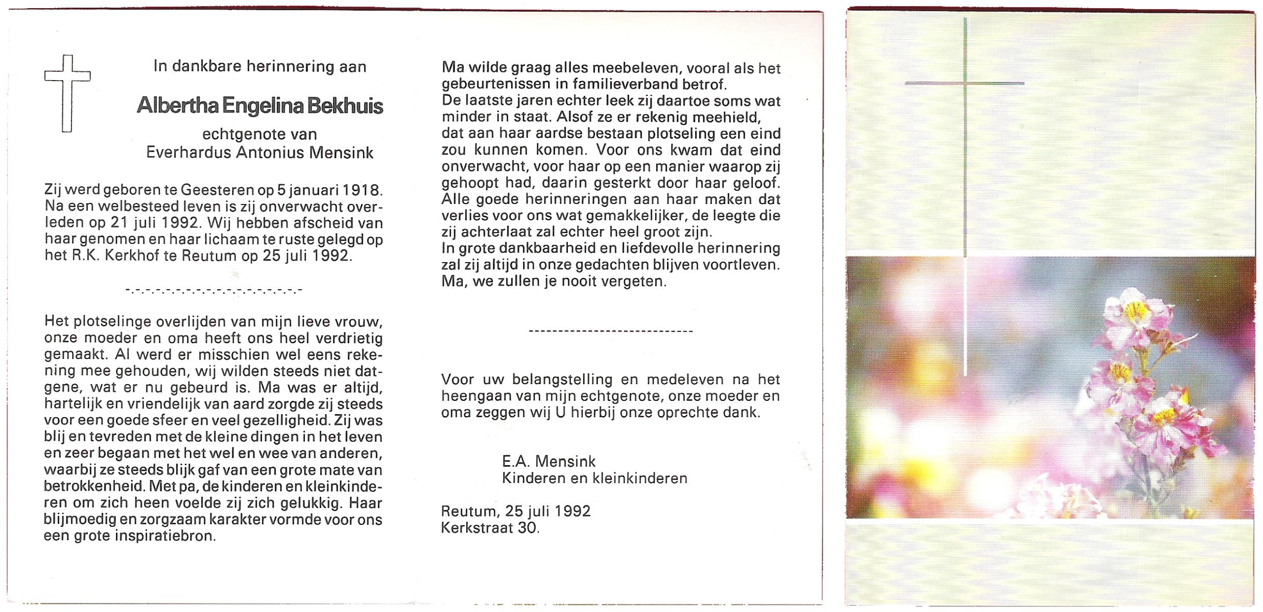 BEKHUIS, Albertha Engelina, geboren op 5-1-1918 te Geesteren (Ov.), overleden op 21-7-1992 op 74-jarige leeftijd, begraven op 25-7-1992 te Reutum.