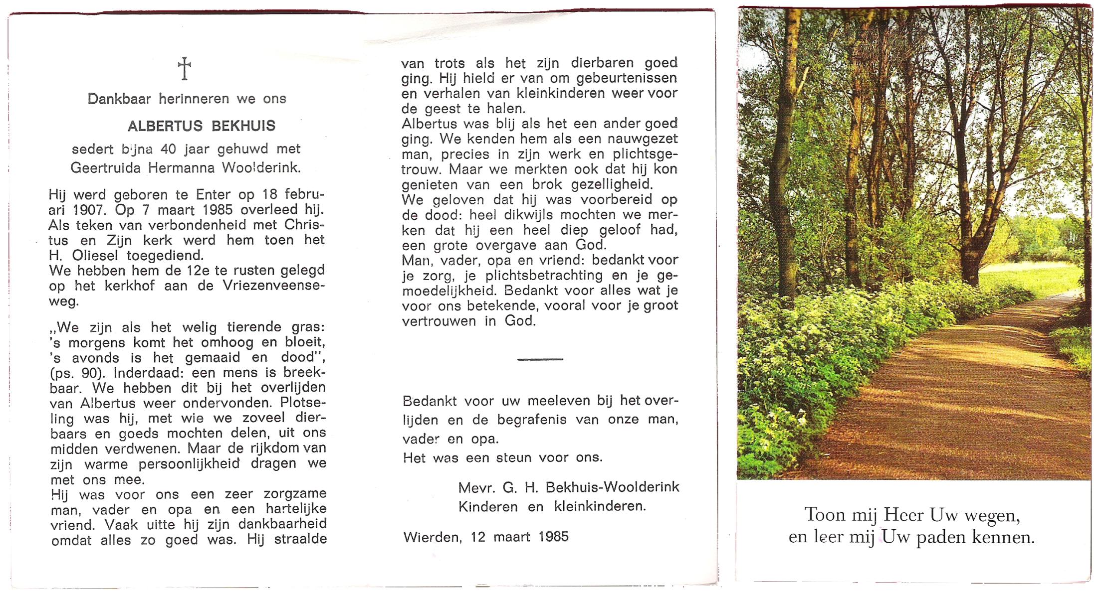 BEKHUIS, Albertus, geboren op 18-2-1907 te Enter, overleden op 7-3-1985 te Enter op 78-jarige leeftijd, begraven op 12-3-1985 te Enter.