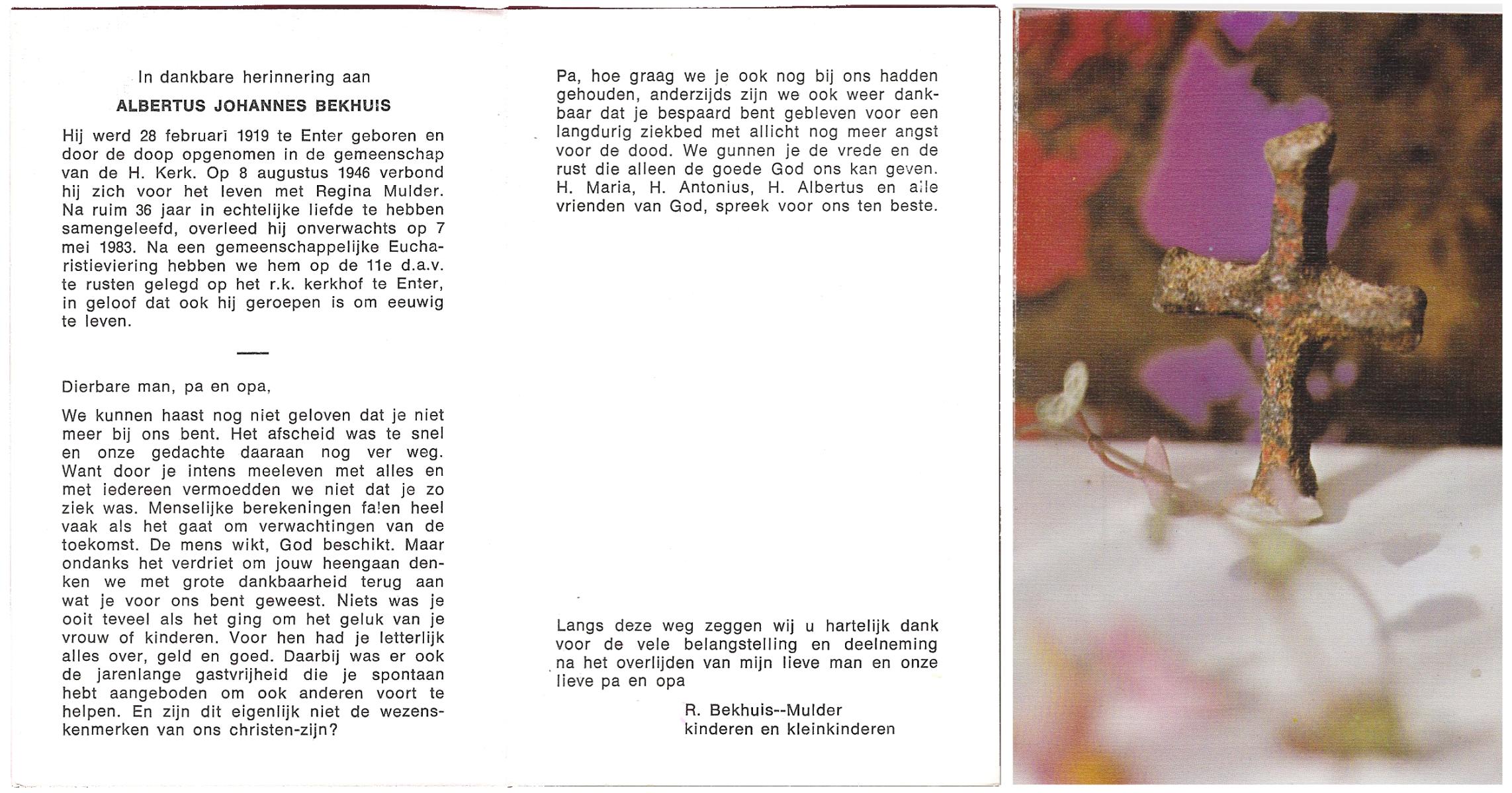 BEKHUIS, Albertus Johannes, geboren op 28-2-1919 te Enter, overleden op 7-5-1983 te Enter op 64-jarige leeftijd, begraven op 11-5-1983 te Enter.
