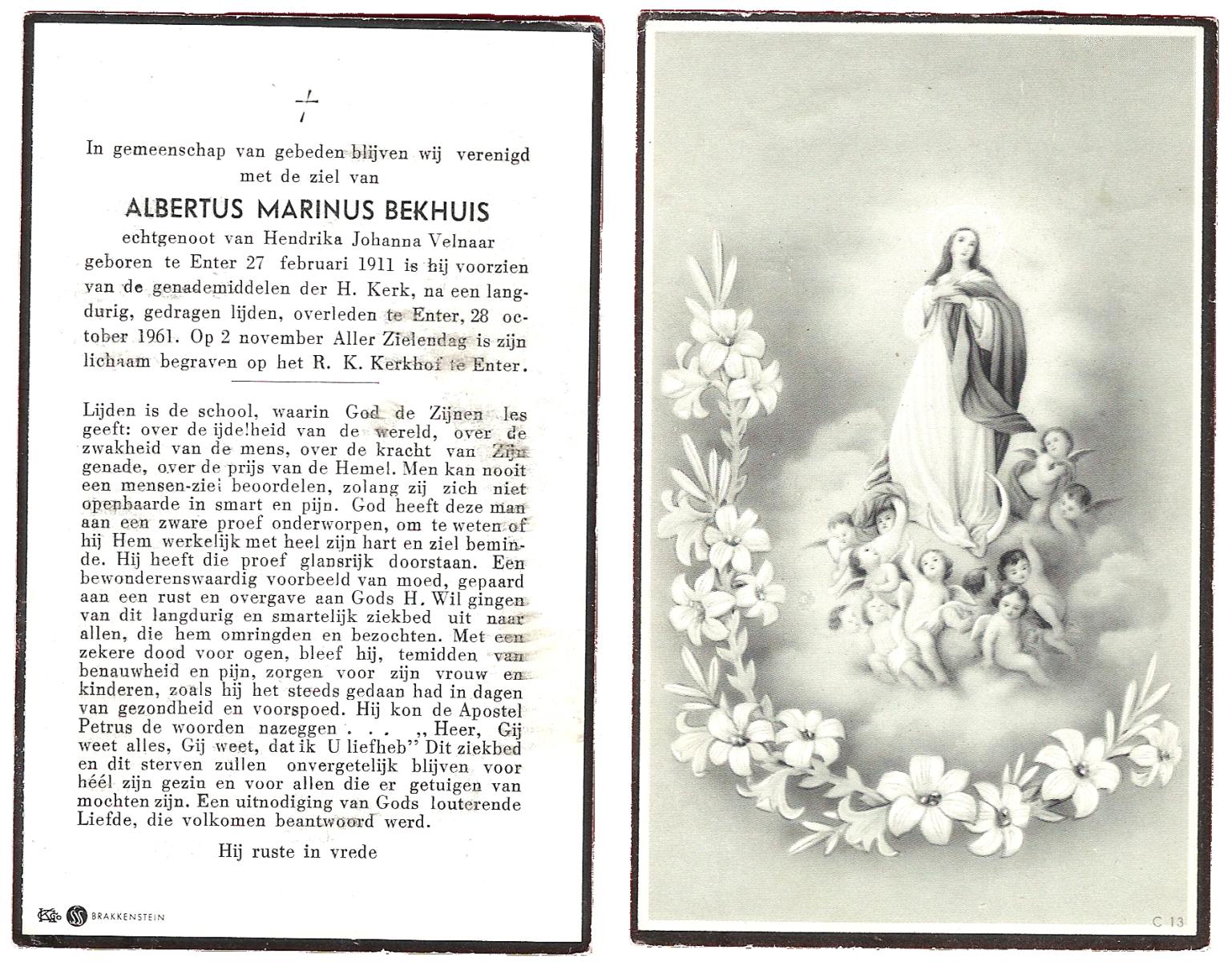 BEKHUIS, Albertus Marinus, geboren op 27-2-1911 te Enter, overleden op 28-10-1961 te Enter op 50-jarige leeftijd, begraven op 2-11-1961 te Enter.