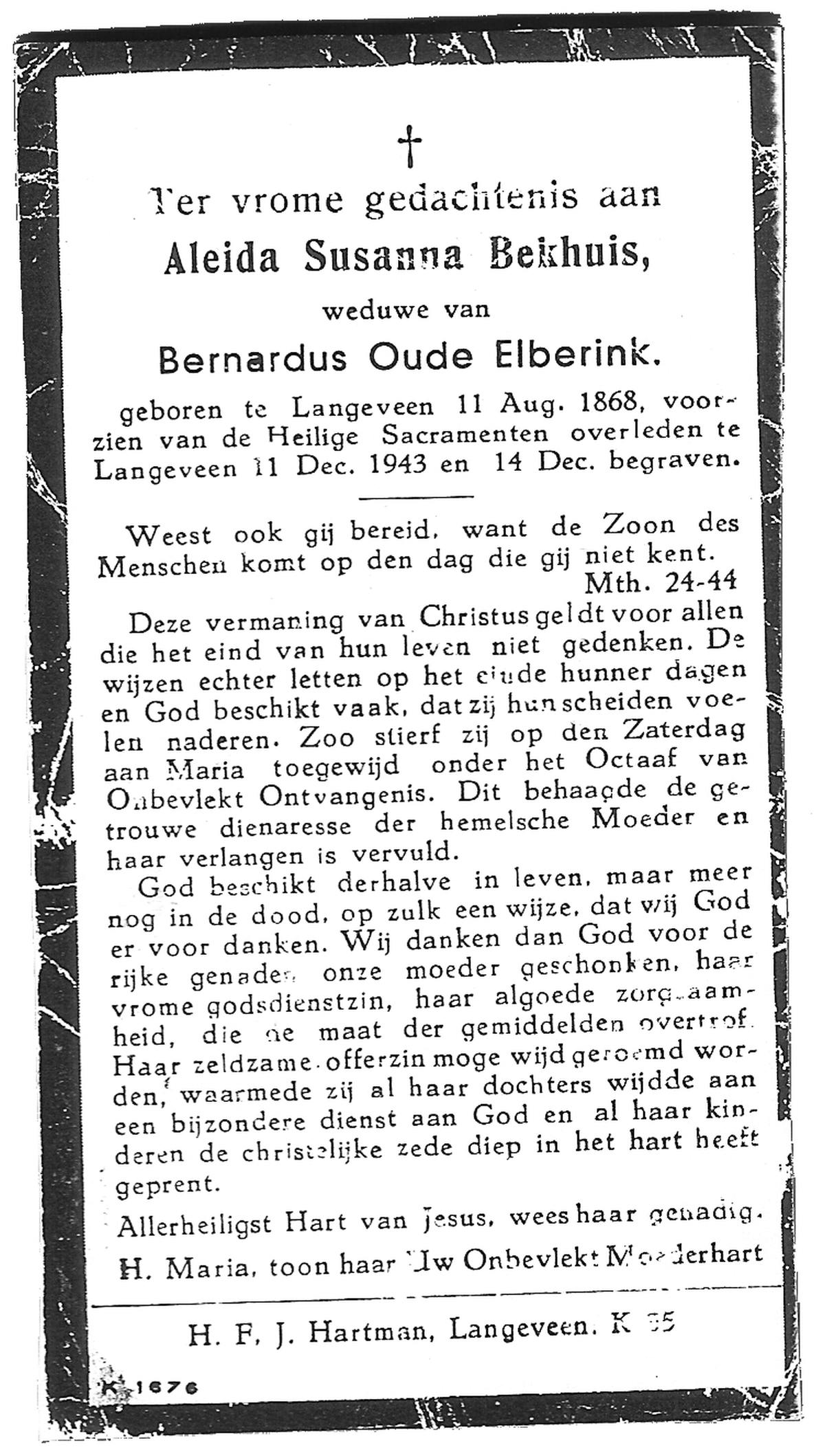 BEKHUIS, Aleida Susanna, geboren op 11-08-1868 te Langeveen, overleden op 11-12-1943 te Langeveen op 75-jarige leeftijd, begraven op 14-12-1943 te Langeveen.