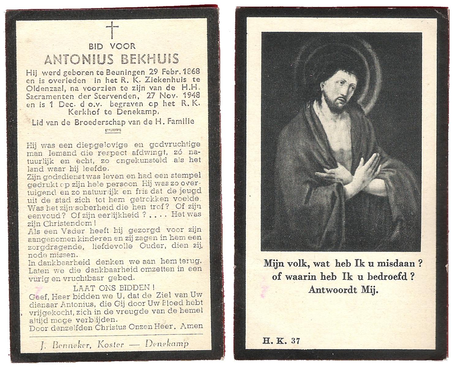 BEKHUIS, Antonius, geboren op 29-02-1868 te Beuningen (Ov.), overleden op 27-11-1948 te Oldenzaal op 80-jarige leeftijd, begraven op 1-12-1948 te Denekamp.