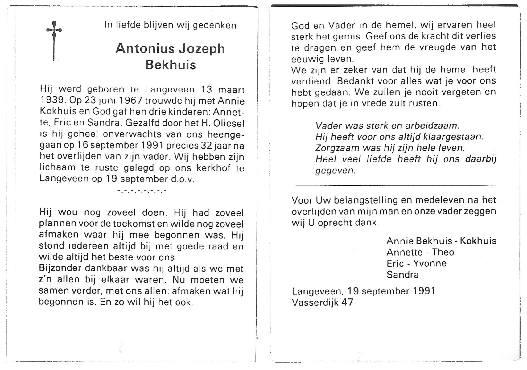 BEKHUIS, Antonius Jozeph, geboren op 13-3-1939 te Langeveen, overleden op 16-9-1991 op 52-jarige leeftijd, begraven op 19-9-1991 te Langeveen.