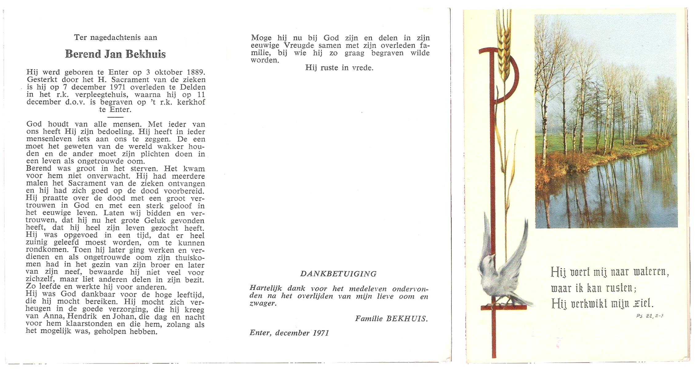 BEKHUIS, Berend Jan, geboren op 03-10-1889 te Enter, overleden op 7-12-1971 te Delden op 81-jarige leeftijd, begraven op 11-12-1971 te Enter.