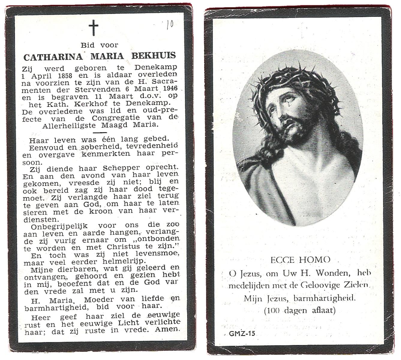 BEKHUIS, Catharina Maria, geboren op 01-04-1858 te Denekamp, overleden op 6-3-1946 te Denekamp op 87-jarige leeftijd, begraven op 11-3-1946 te Denekamp.