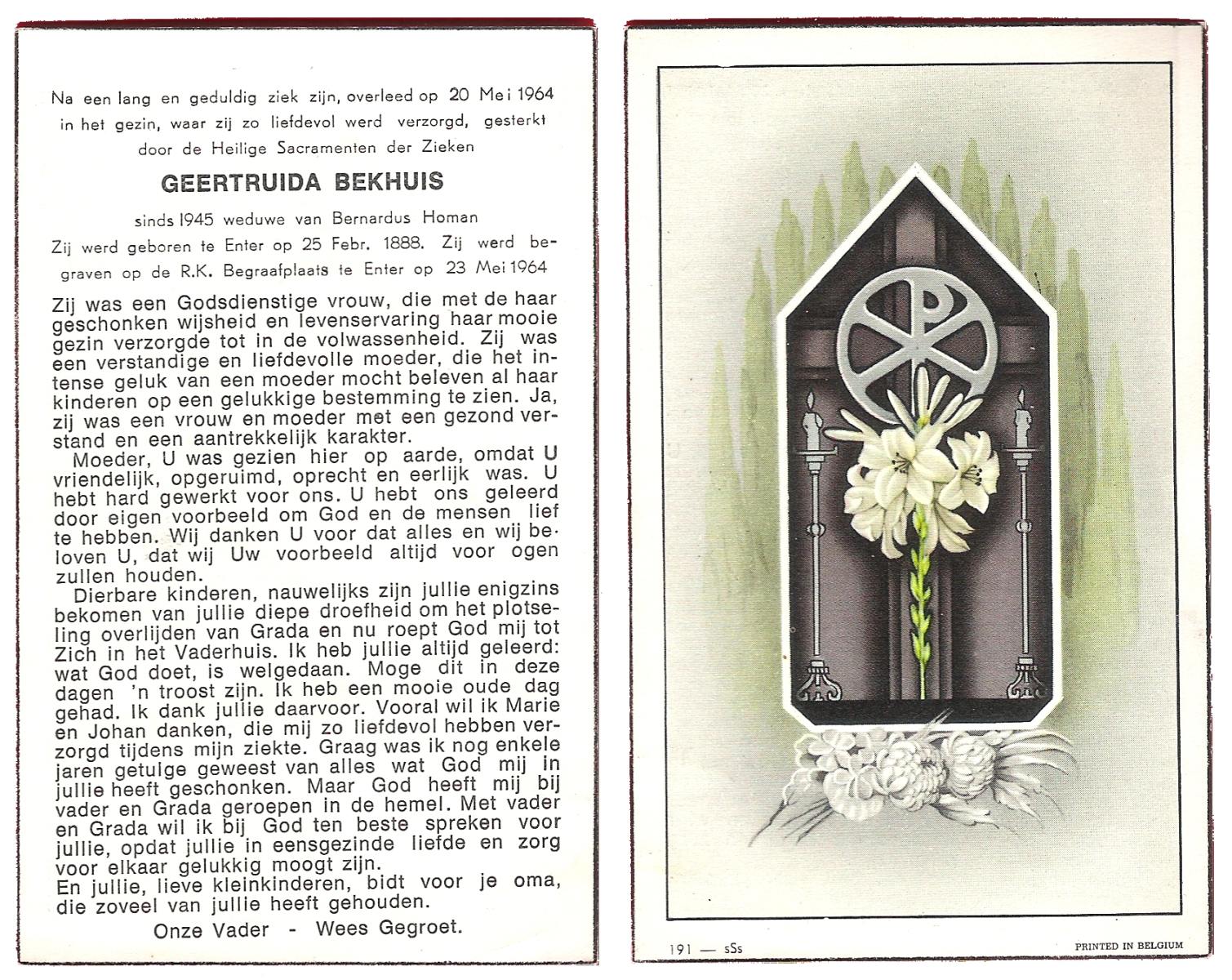 BEKHUIS, Geertruida, geboren op 25-02-1888 te Enter, overleden op 20-5-1964 te Enter op 76-jarige leeftijd, begraven op 23-5-1964 te Enter.