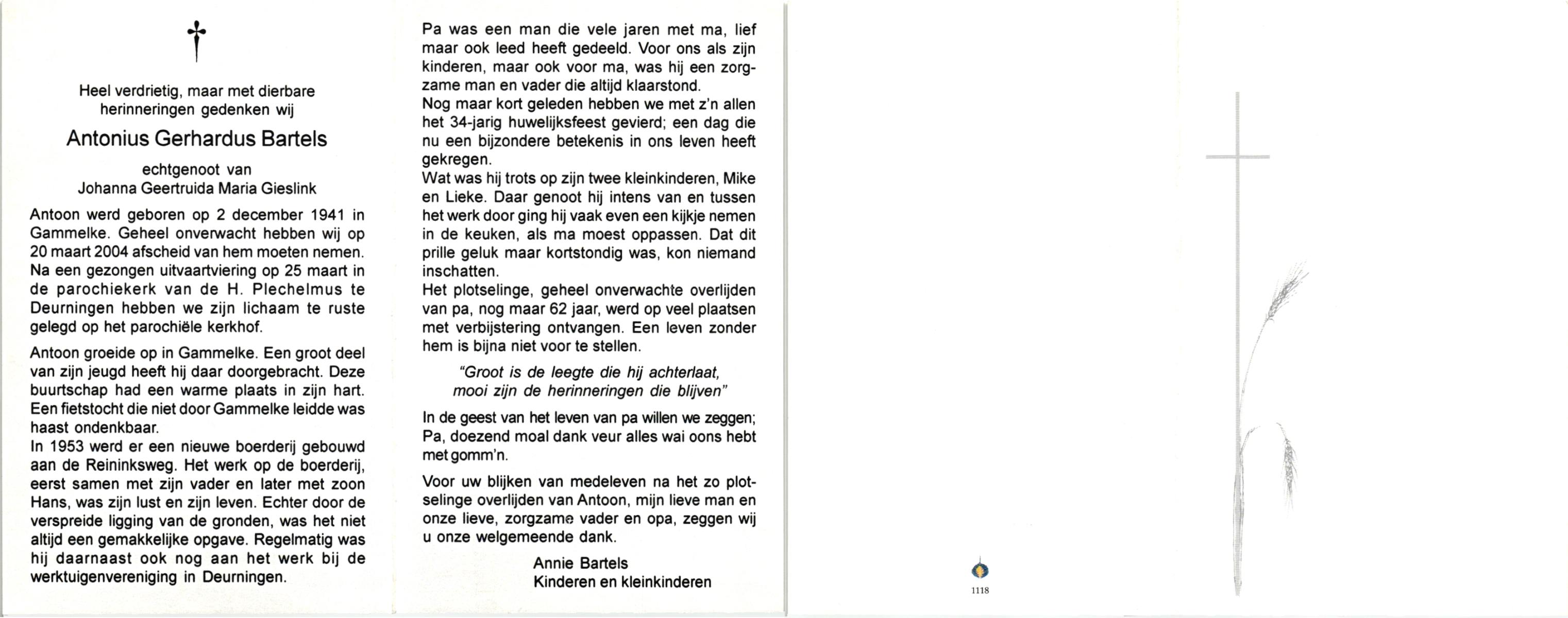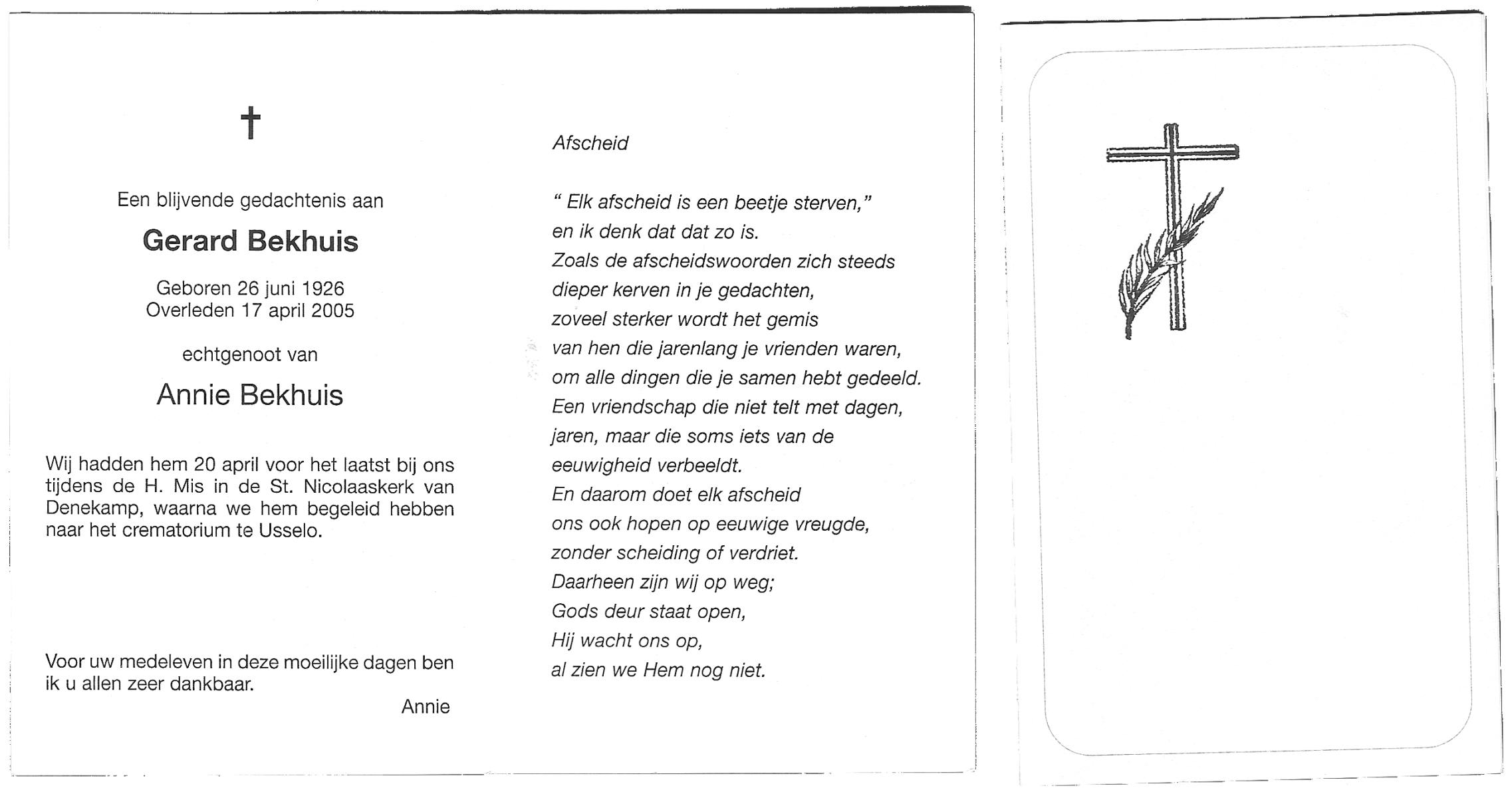 BEKHUIS, Gerard, geboren op 26-6-1926, overleden op 17-4-2005 op 78-jarige leeftijd, gecremeerd op 20-4-2005 te Usselo.