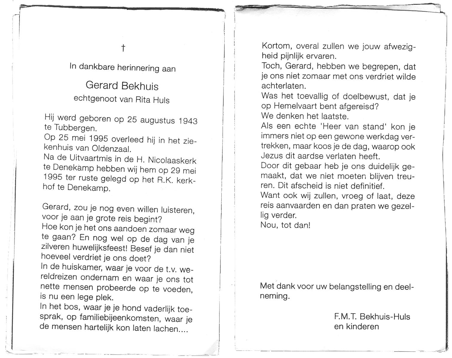 BEKHUIS, Gerard, geboren op 25-8-1943 te Tubbergen, overleden op 25-5-1995 te Oldenzaal op 51-jarige leeftijd, begraven op 29-5-1995 te Denekamp R.K.kerkhof.
