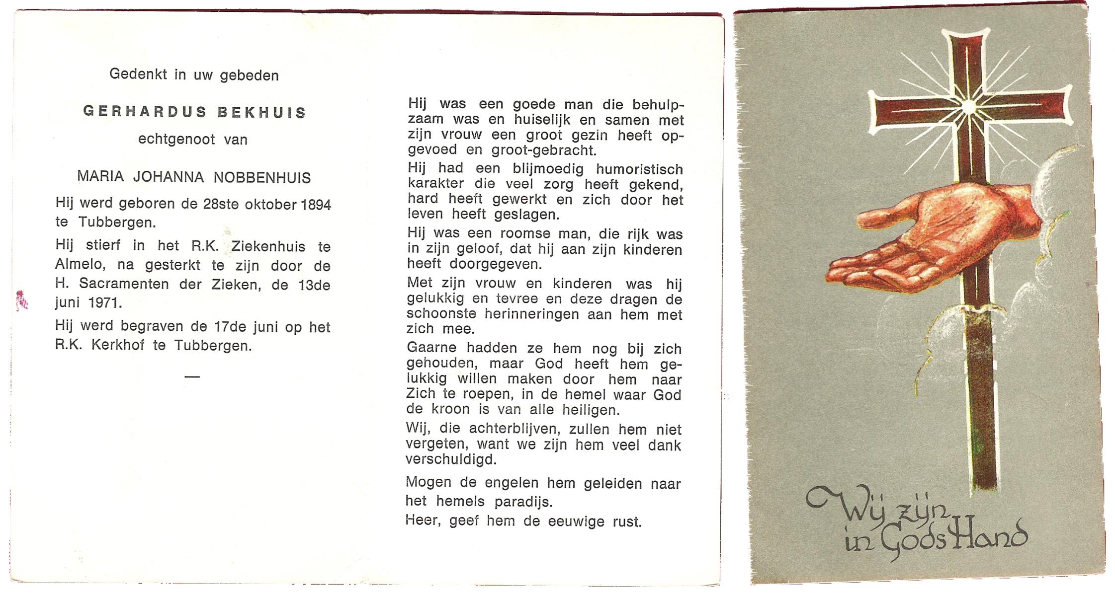 BEKHUIS, Gerhardus, geboren op 28-10-1894 te Tubbergen, overleden op 13-6-1971 te Almelo op 76-jarige leeftijd, begraven op 17-6-1971 te Tubbergen.