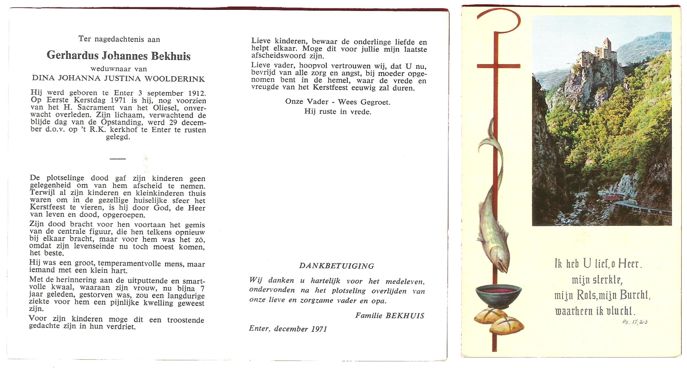 BEKHUIS, Gerhardus Johannes, geboren op 3-9-1912 te Enter, overleden op 25-12-1971 te Enter op 58-jarige leeftijd, begraven op 29-12-1971 te Enter.