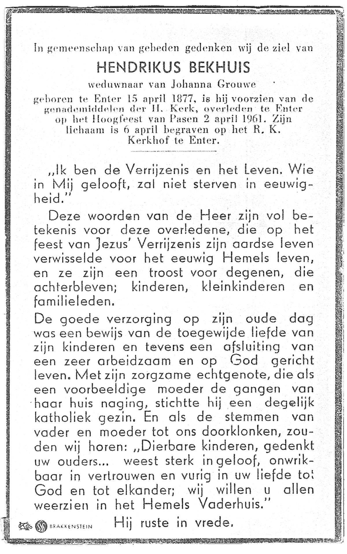 BEKHUIS, Hendrikus, geboren op 15-04-1877 te Enter, overleden op 2-4-1961 te Enter op 83-jarige leeftijd, begraven op 6-4-1961 te Enter.