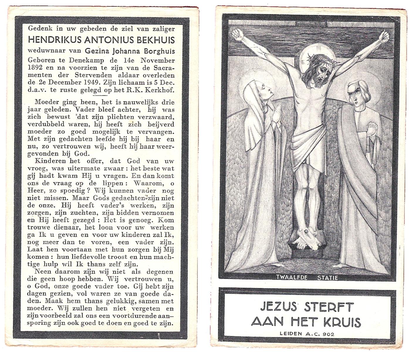 BEKHUIS, Hendrikus Antonius, geboren op 14-11-1892 te Denekamp, overleden op 2-12-1949 te Denekamp op 55-jarige leeftijd, begraven op 5-12-1949 te Denekamp.