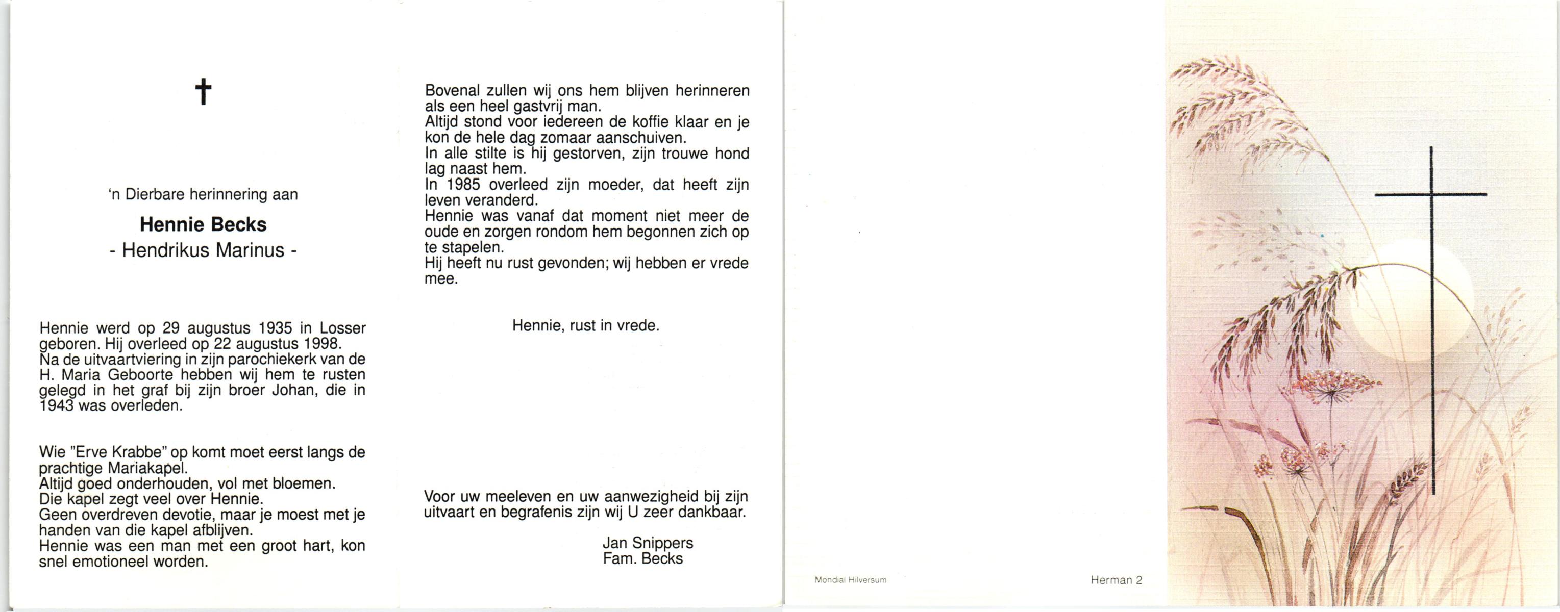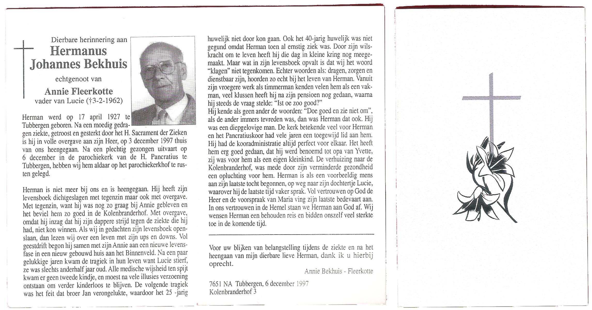 BEKHUIS, Hermanus Johannes, geboren op 17-4-1927 te Tubbergen, overleden op 3-12-1997 te Tubbergen op 70-jarige leeftijd, begraven op 6-12-1997 te Tubbergen.