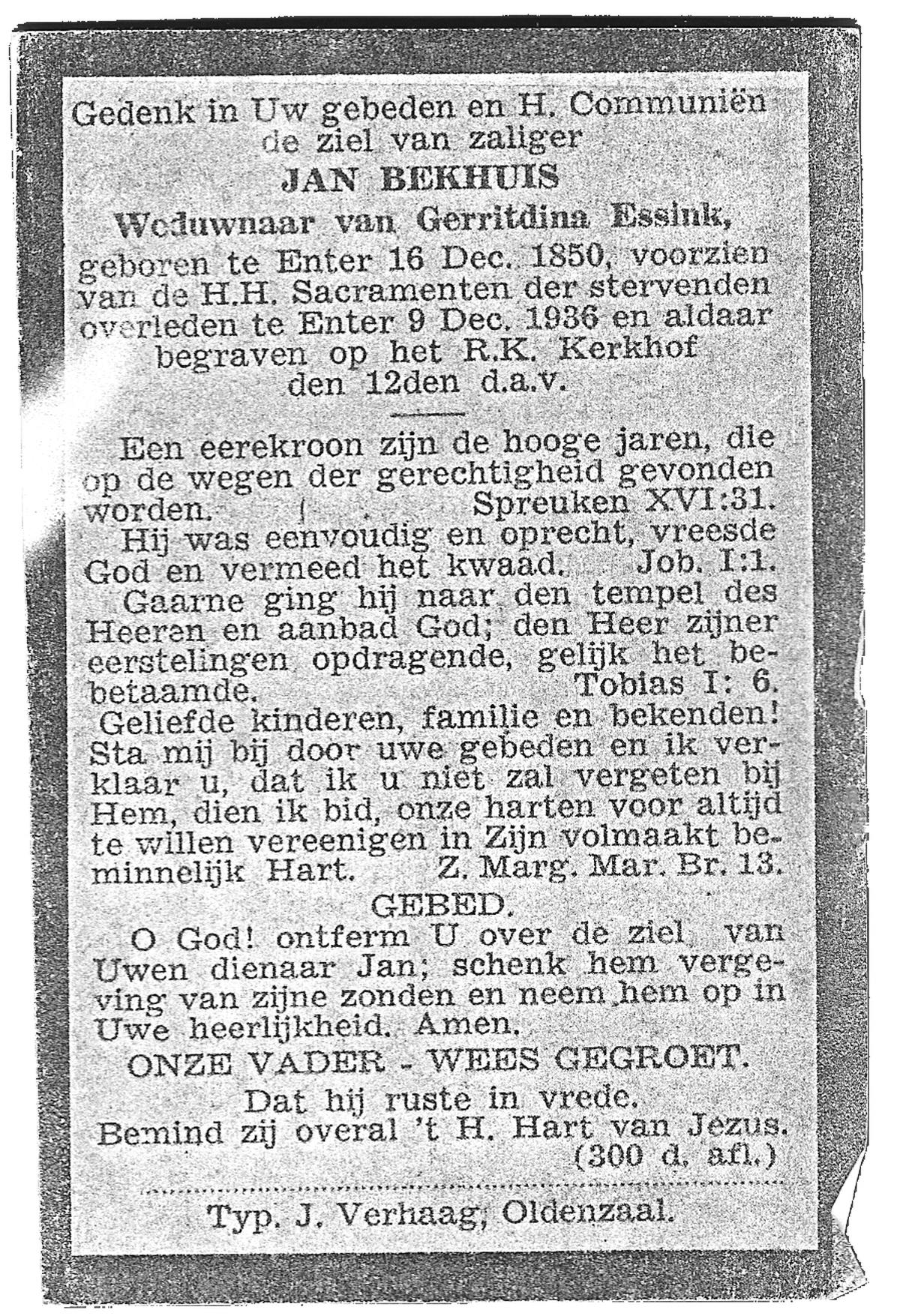 BEKHUIS, Jan, geboren op 16-12-1850 te Enter, overleden op 9-12-1936 te Enter op 85-jarige leeftijd, begraven op 12-12-1936 te Enter.