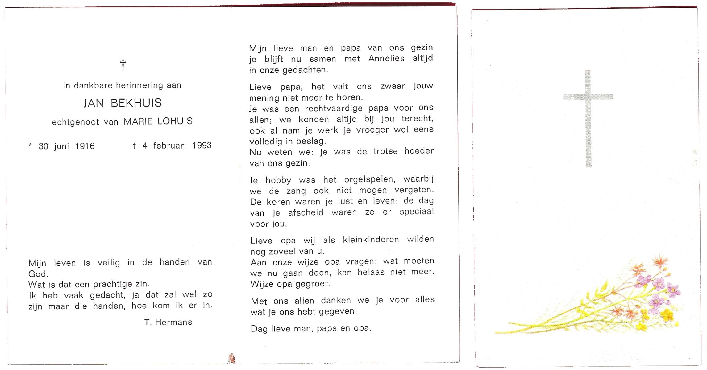 BEKHUIS, Jan, geboren op 30-6-1916, overleden op 4-2-1993 op 76-jarige leeftijd.