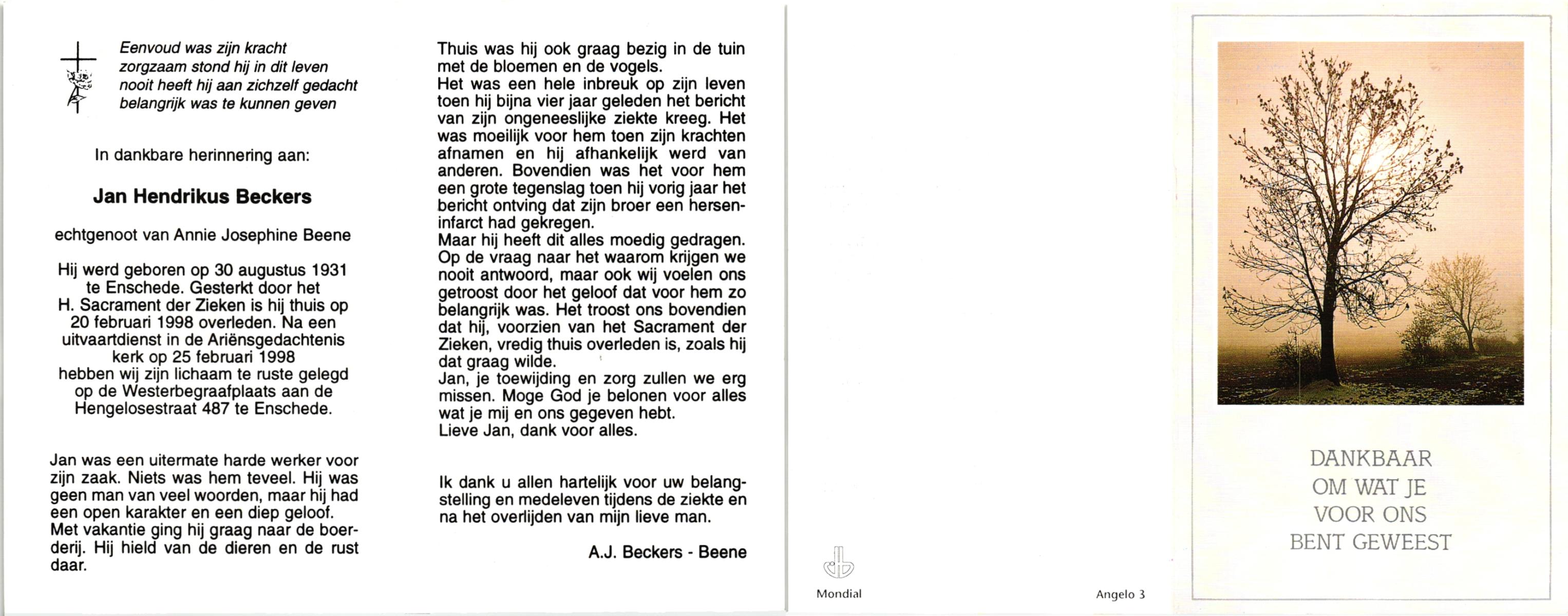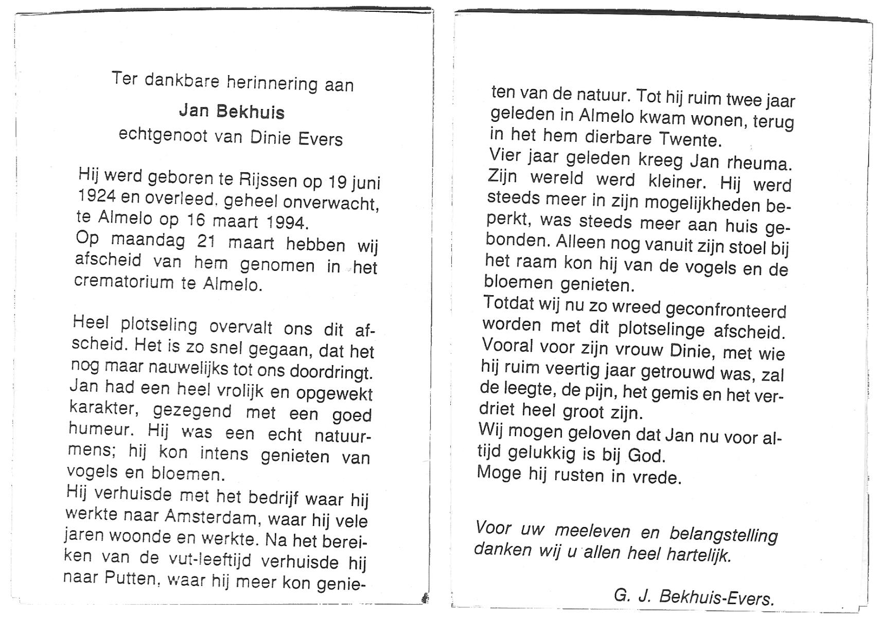 BEKHUIS, Jan, geboren op 19-6-1924 te Rijssen, overleden op 16-3-1994 te Almelo op 69-jarige leeftijd, gecremeerd op 21-3-1994 te Almelo.