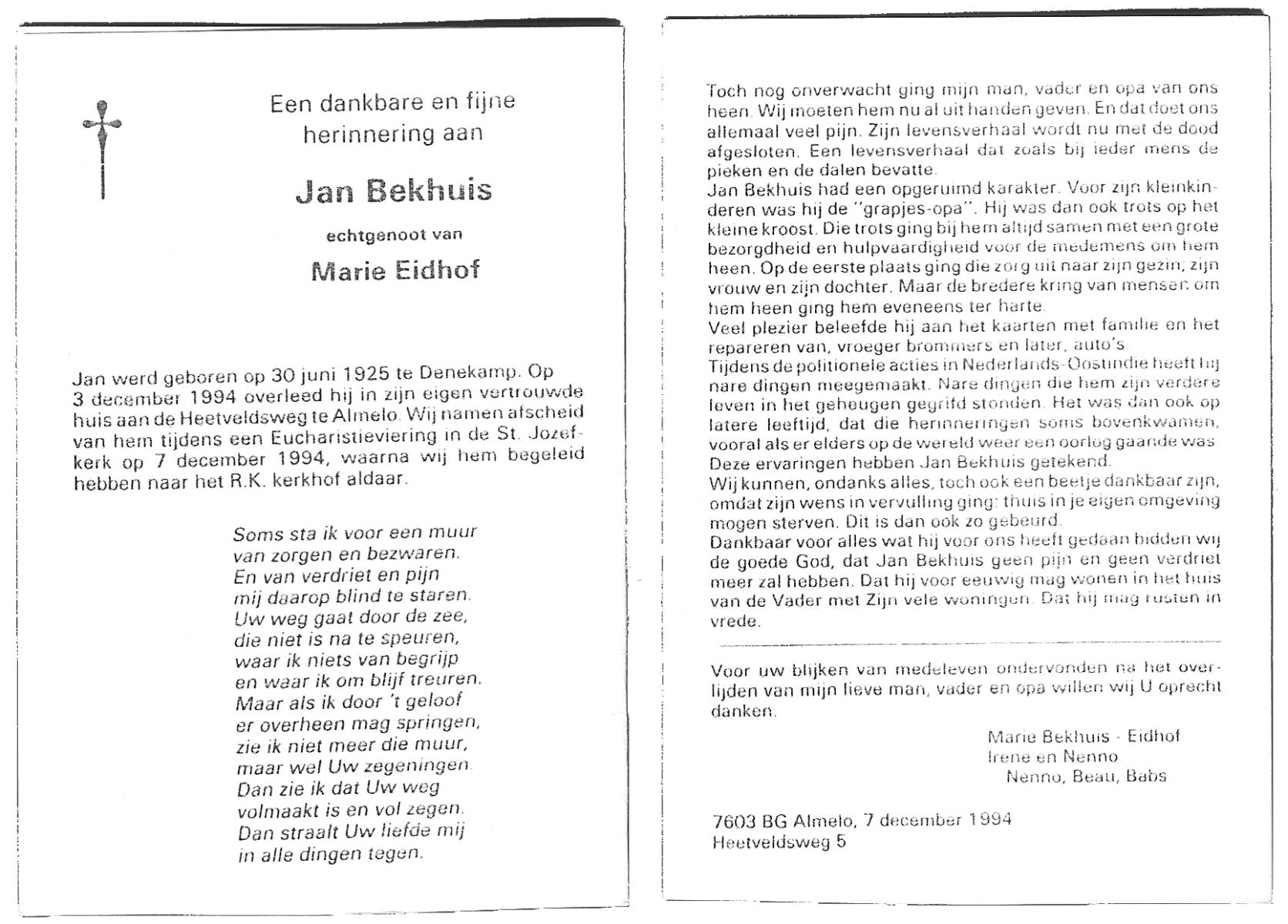 BEKHUIS, Jan, geboren op 30-6-1925 te Denekamp, overleden op 3-12-1994 te Almelo op 69-jarige leeftijd, begraven op 7-12-1994 te Almelo.