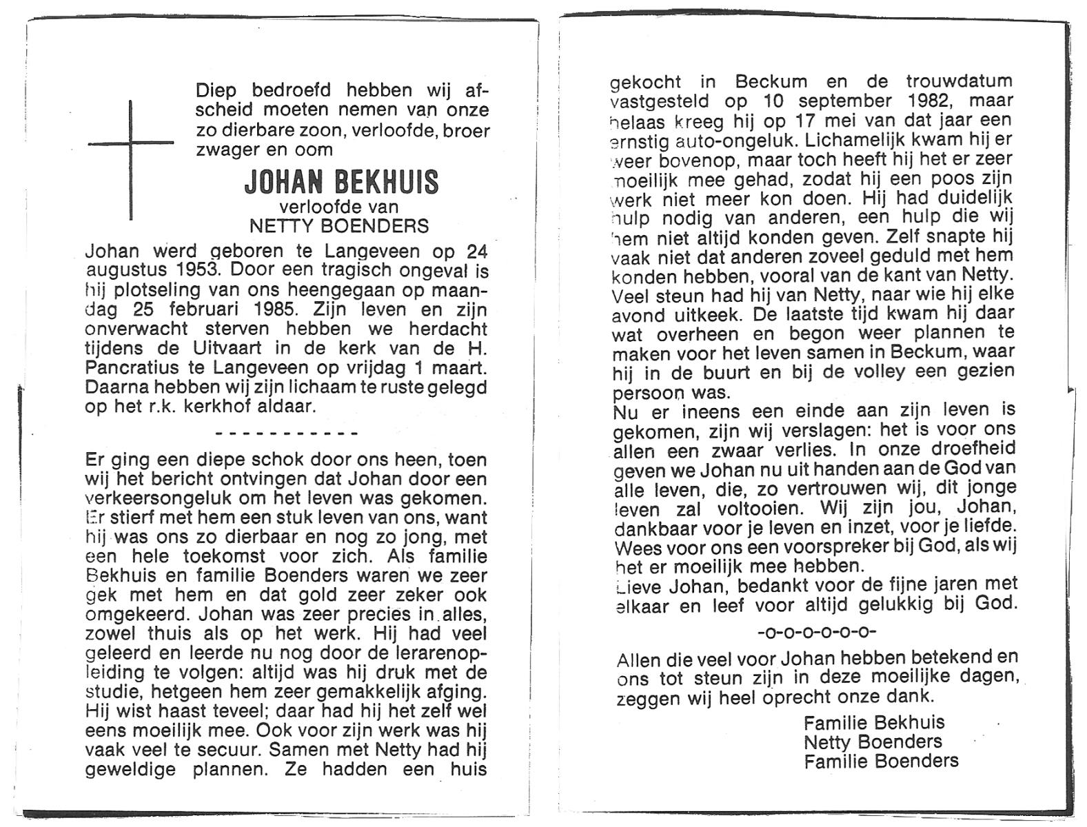 BEKHUIS, Johan, geboren op 24-8-1953 te Langeveen, overleden op 25-2-1985 op 31-jarige leeftijd, begraven op 1-3-1985 te Langeveen R.K.kerhof.