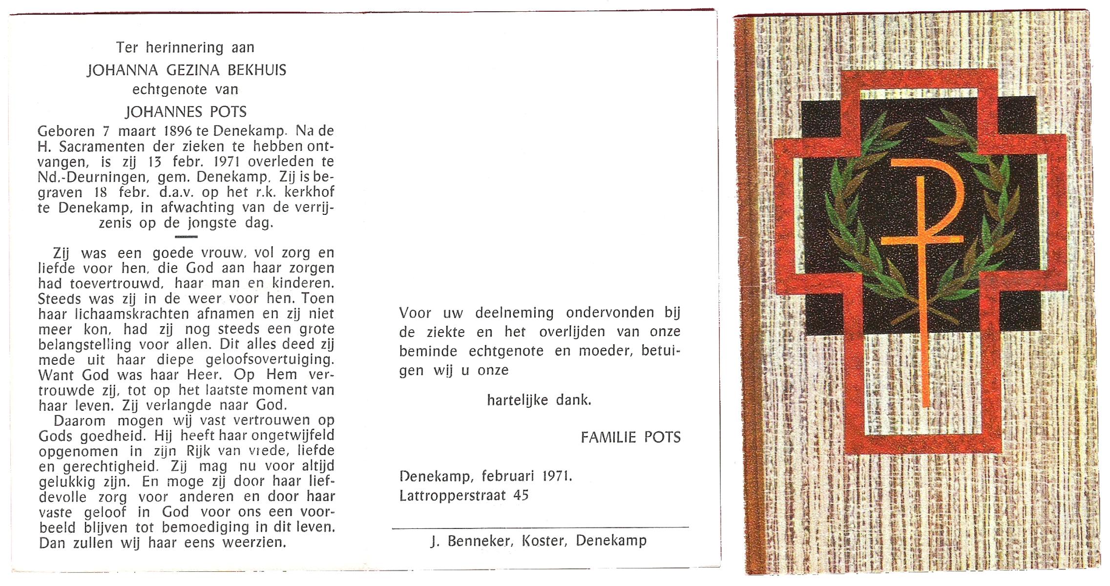 BEKHUIS, Johanna Gezina, geboren op 07-03-1896 te Denekamp, overleden op 13-2-1971 te Noord Deurningen op 75-jarige leeftijd, begraven op 18-2-1971 te Denekamp.