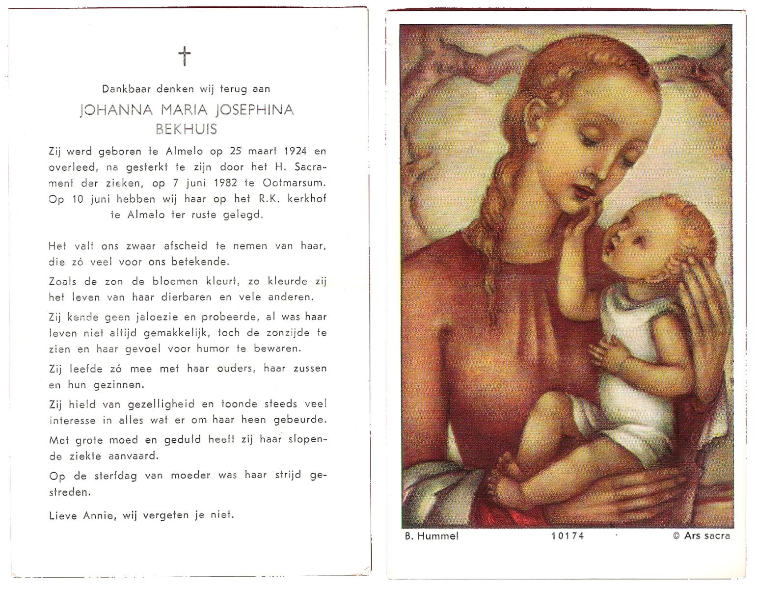 BEKHUIS, Johanna Maria Josephina, geboren op 25-3-1924 te Almelo, overleden op 7-6-1982 te Ootmarsum op 58-jarige leeftijd, begraven op 10-6-1982 te Almelo.