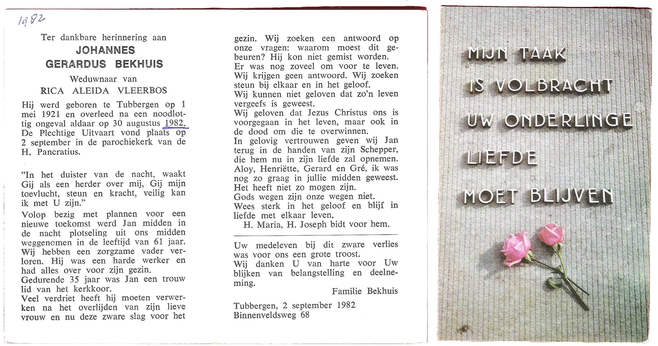 BEKHUIS, Johannes Gerardus, geboren op 1-5-1921 te Tubbergen, overleden op 30-8-1982 te Tubbergen op 61-jarige leeftijd, begraven op 2-9-1982 te Tubbergen.