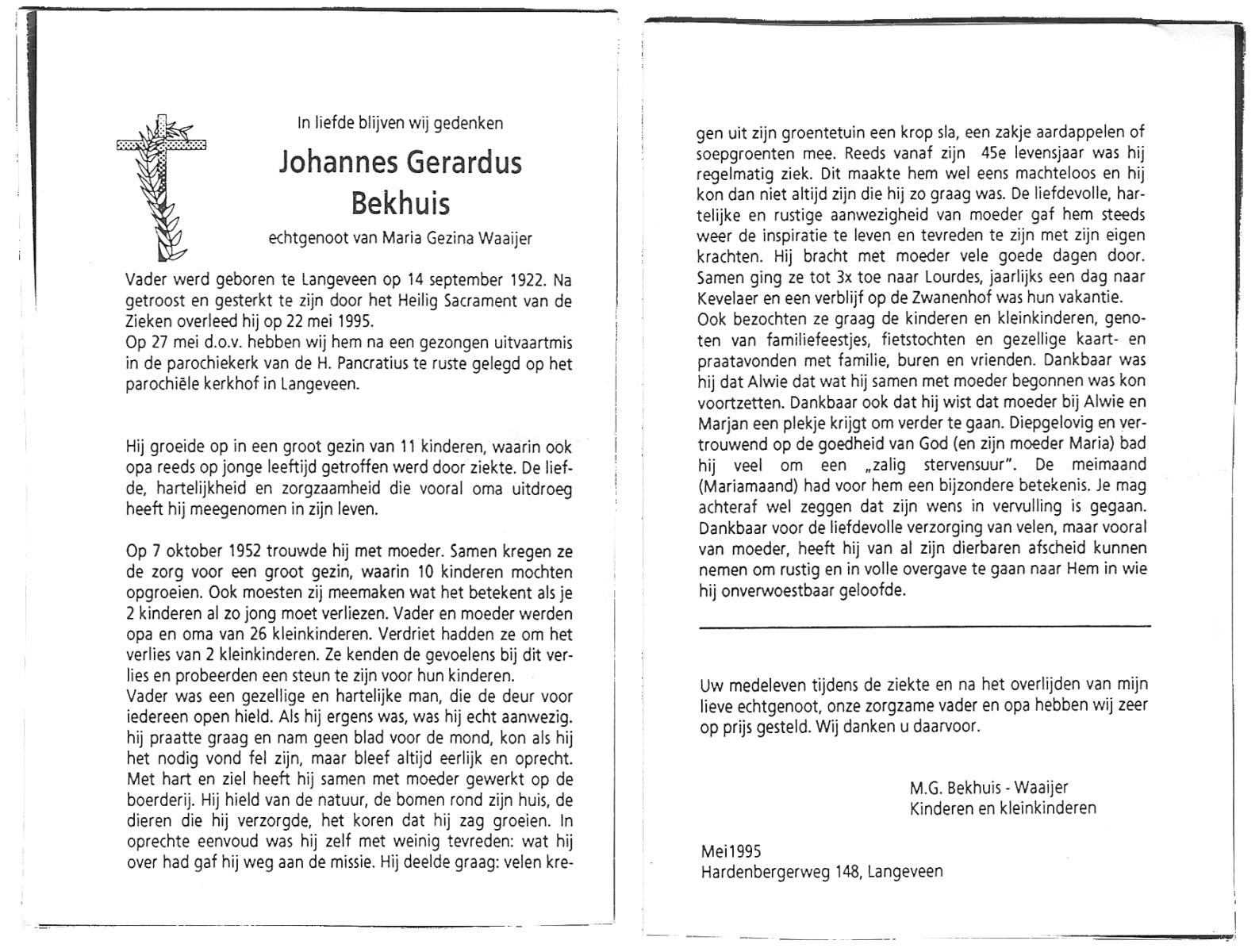 BEKHUIS, Johannes Gerardus, geboren op 14-9-1922 te Langeveen, overleden op 22-5-1995 op 72-jarige leeftijd, begraven op 27-5-1995 te Langeveen R.K.kerhof.