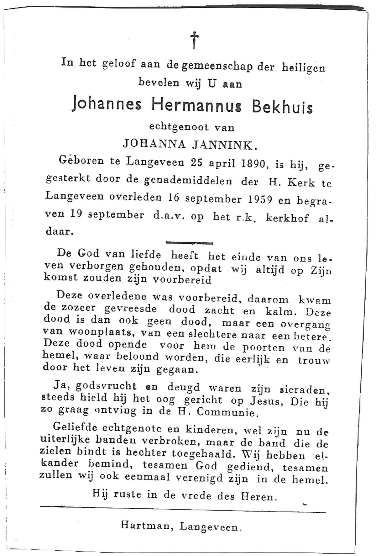 BEKHUIS, Johannes Hermannus, geboren op 25-04-1890 te Langeveen, overleden op 16-9-1959 te Langeveen op 69-jarige leeftijd, begraven op 19-9-1959 te Langeveen.
