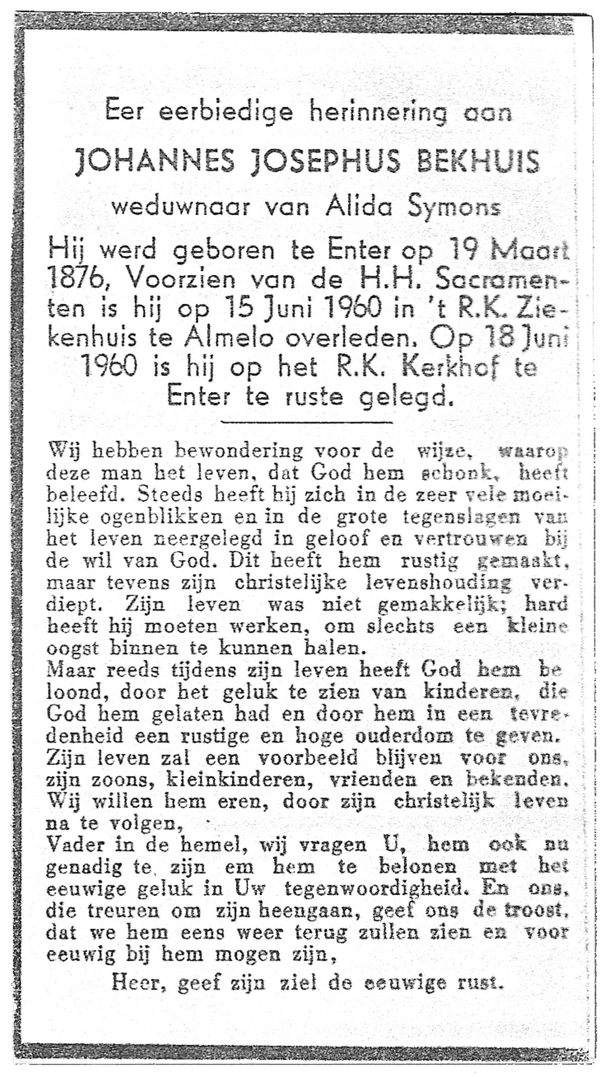 BEKHUIS, Johannes Josephus, geboren op 19-03-1876 te Enter, overleden op 15-6-1960 te Almelo op 84-jarige leeftijd, begraven op 18-6-1960 te Enter.