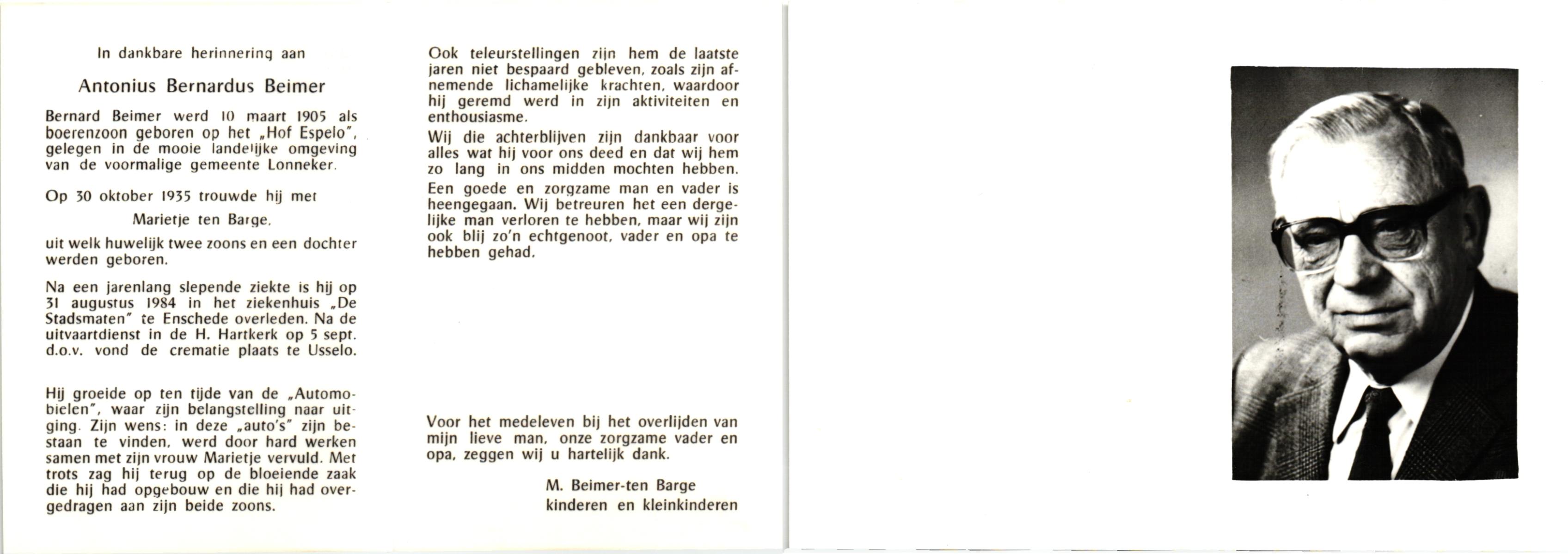 BEIMER, , Antonius Bernardus, geboren op 10-3-1905 te Lonneker, overleden op 31-8-1984 te Enschede op 79-jarige leeftijd, gecremeerd op 5-9-1984 te Usselo.