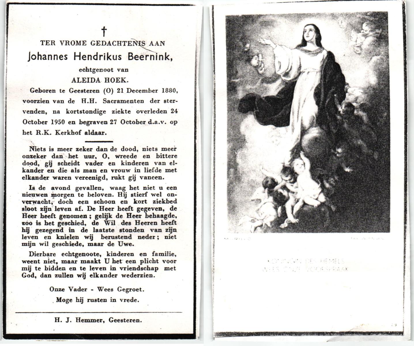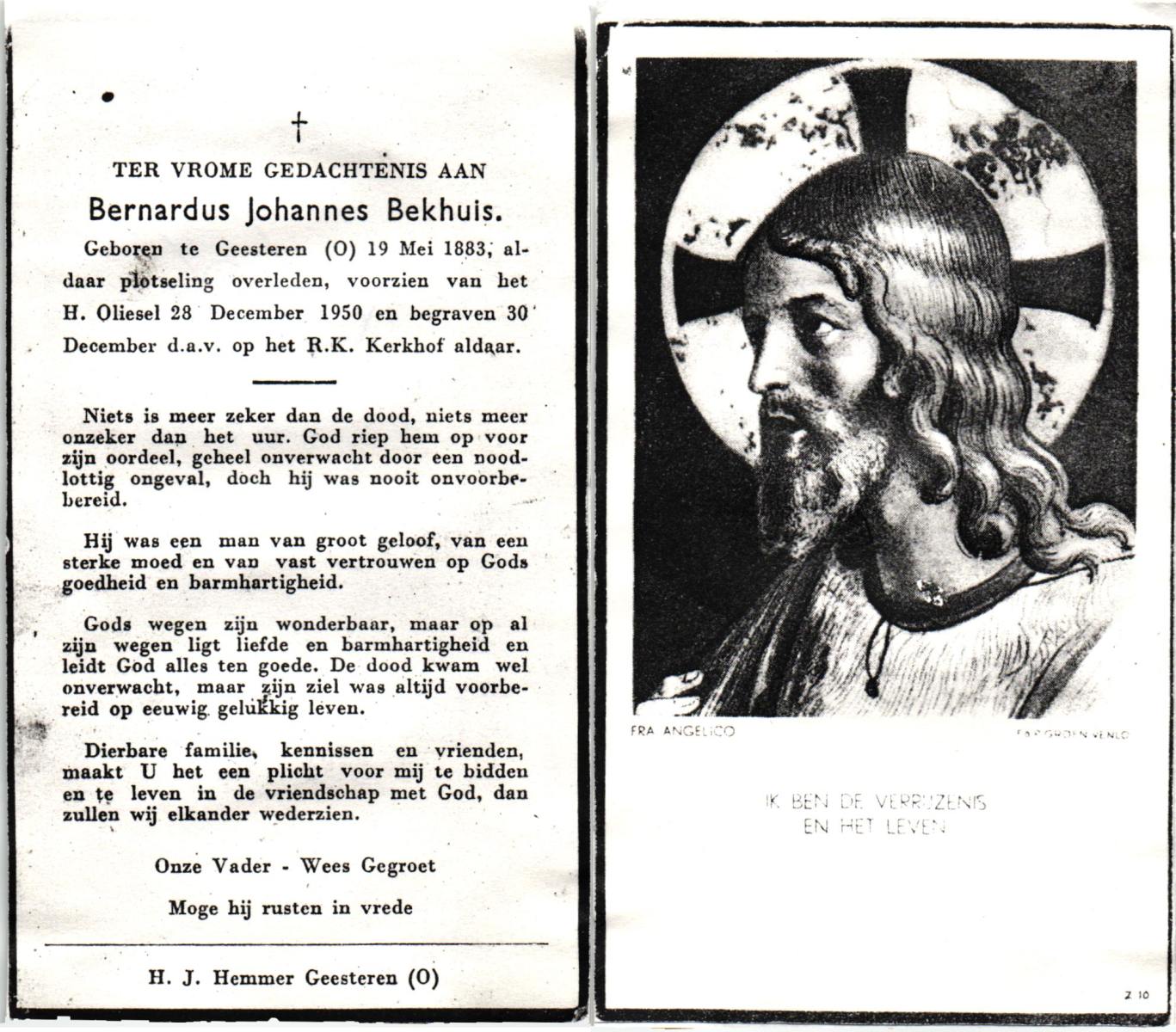 BEKHUIS, Bernardus Johannes, geboren op 19-05-1883 te Geesteren, overleden op 28-12-1950 te Geesteren op 67-jarige leeftijd, begraven op 30-12-1950 te Geesteren.