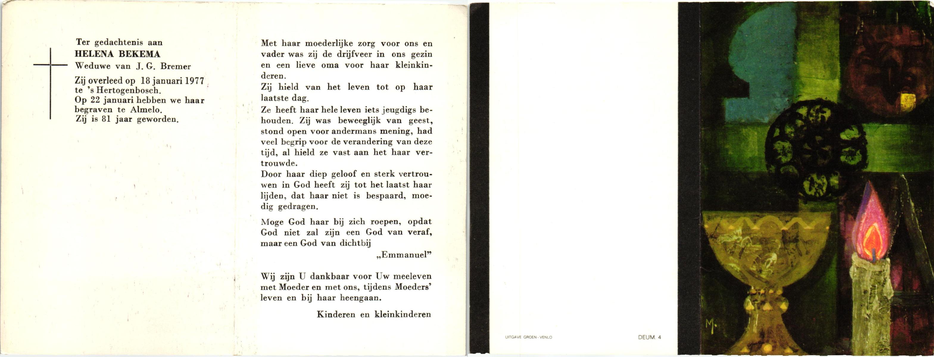 BEKEMA, Helena, overleden op 18-1-1977 te Den Bosch op 81-jarige leeftijd, begraven op 22-1-1977 te Almelo.