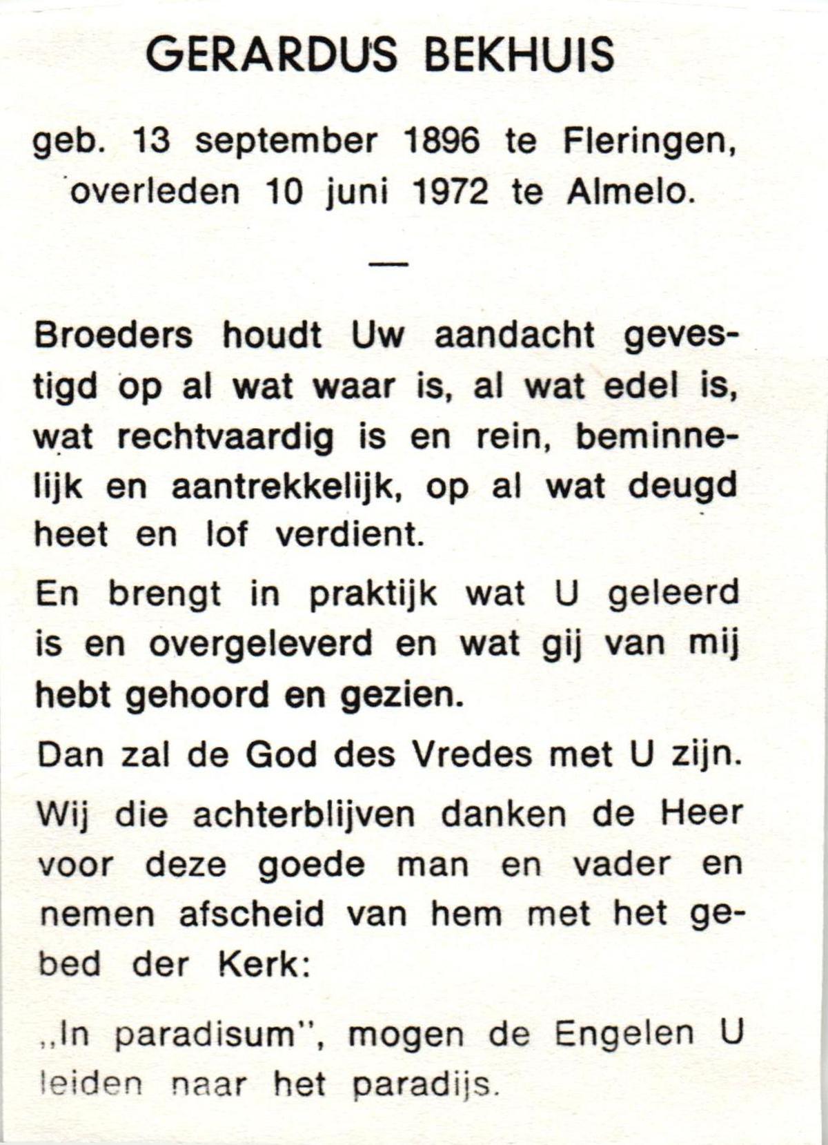 BEKHUIS, Gerardus, geboren op 13-09-1896 te Fleringen, overleden op 10-6-1972 te Almelo op 75-jarige leeftijd.